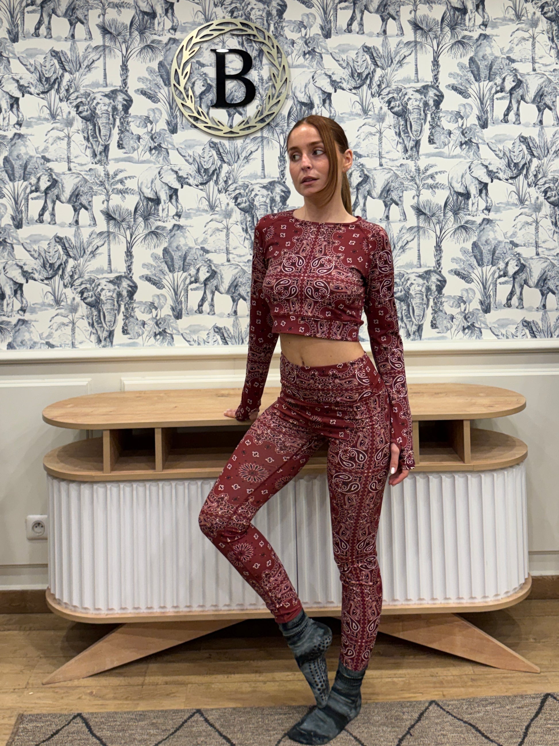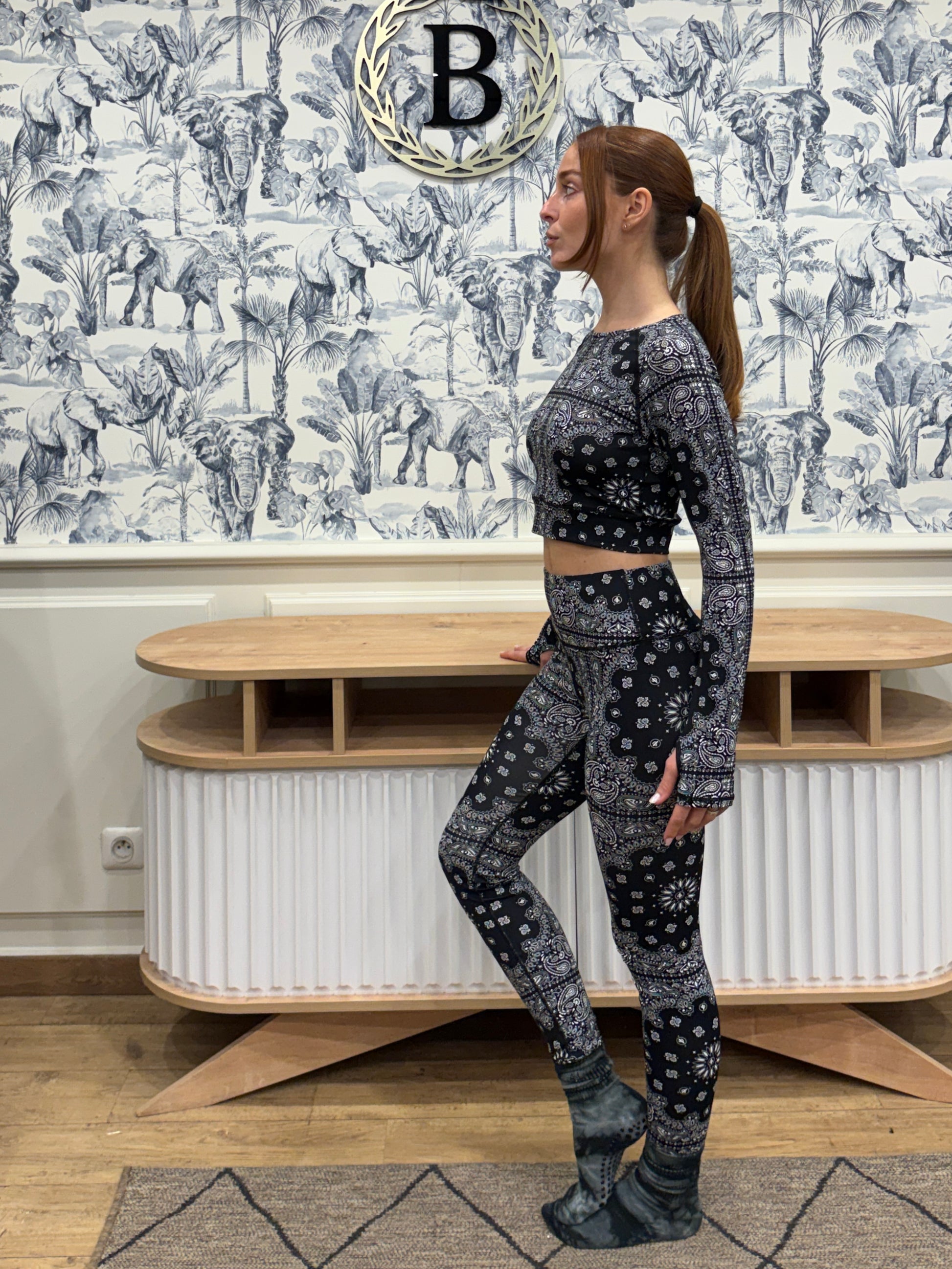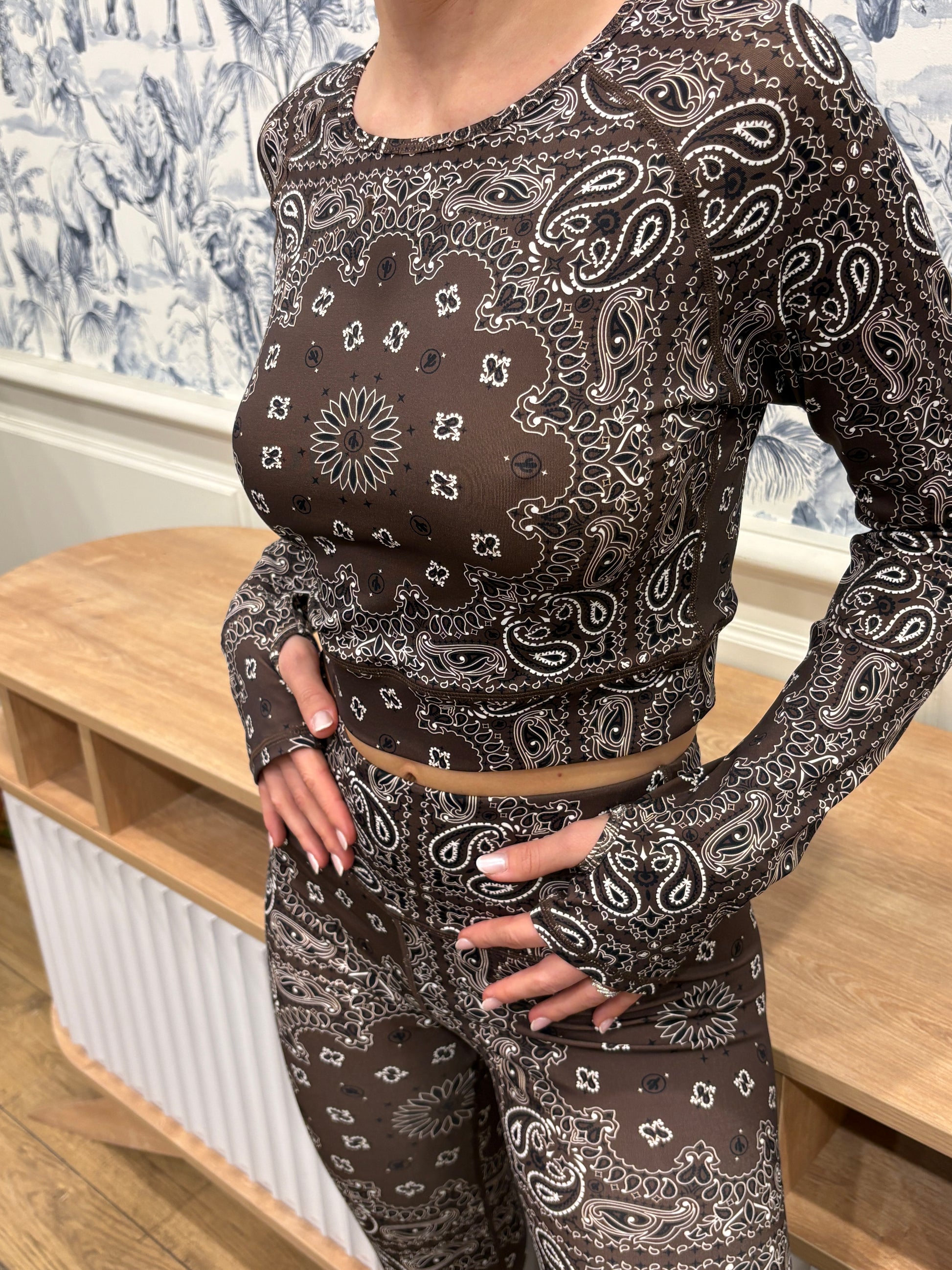 Détails : haut de yoga à manches longues, col rond, motif bandana all-over, passe-pouces intégrés.