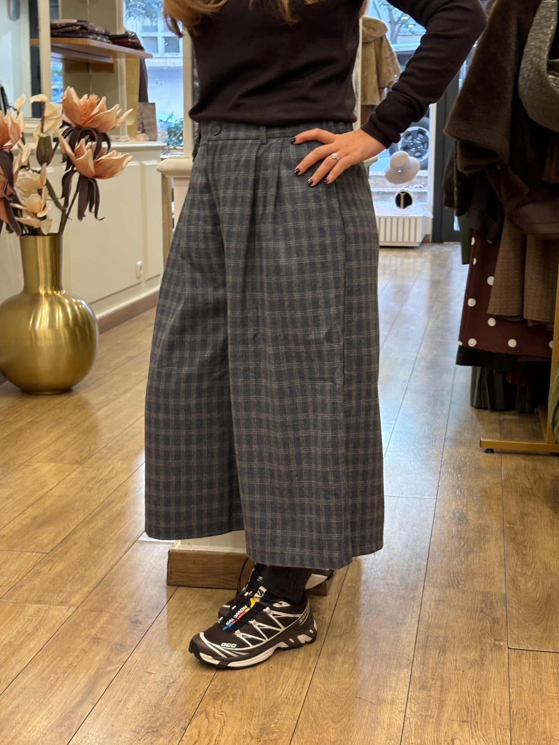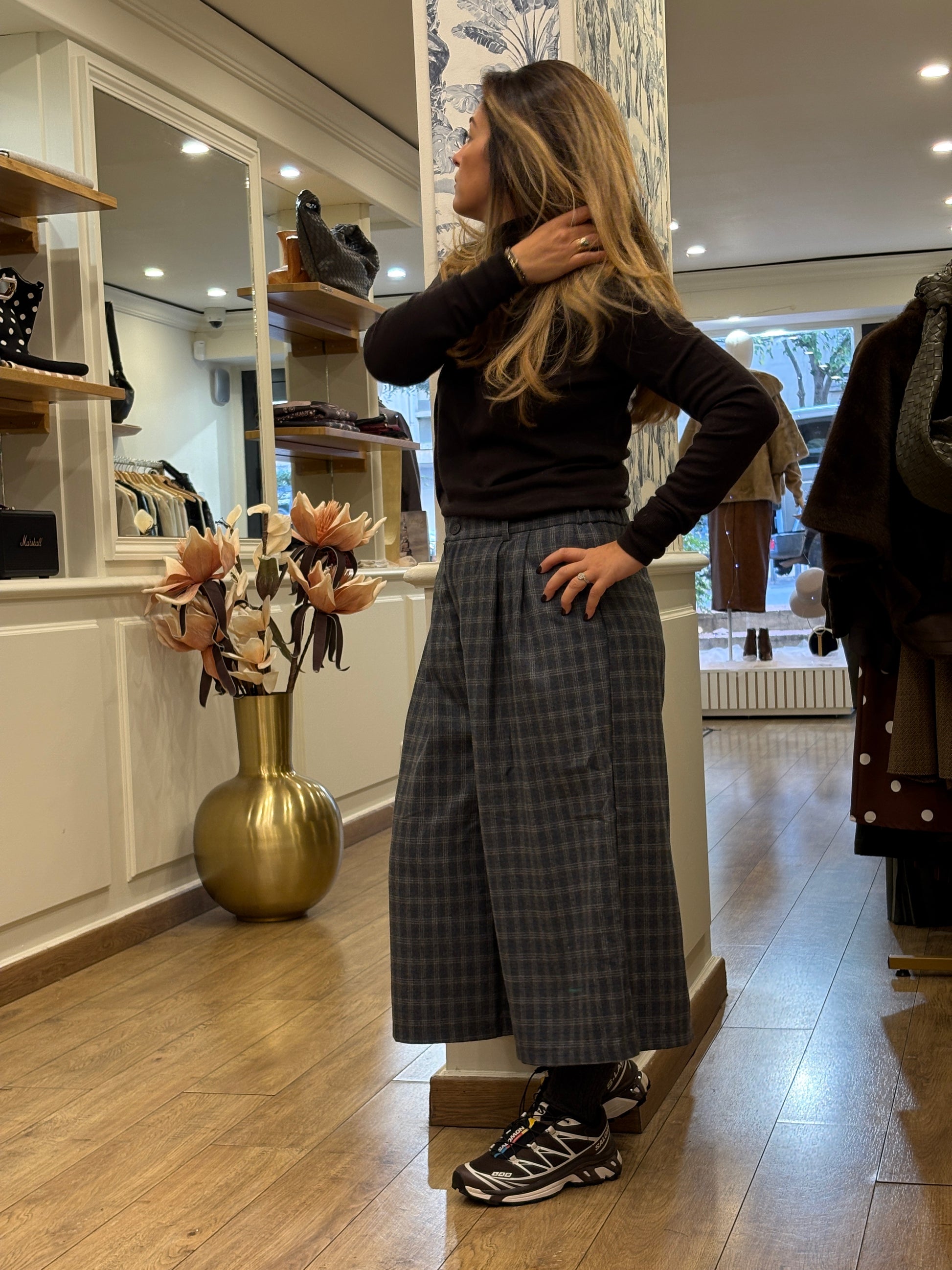 Taille haute, il souligne bien la ligne de la taille puis s’évase sur la jambe avec un volume fluide qui arrive au-dessus de la cheville, ce qui allonge la silhouette. Le tissu est en laine mélangée (effet lainage chaud et souple) avec un carreau discret, chic et facile à porter aussi bien en version bleu/gris qu’en version brun/chocolat.