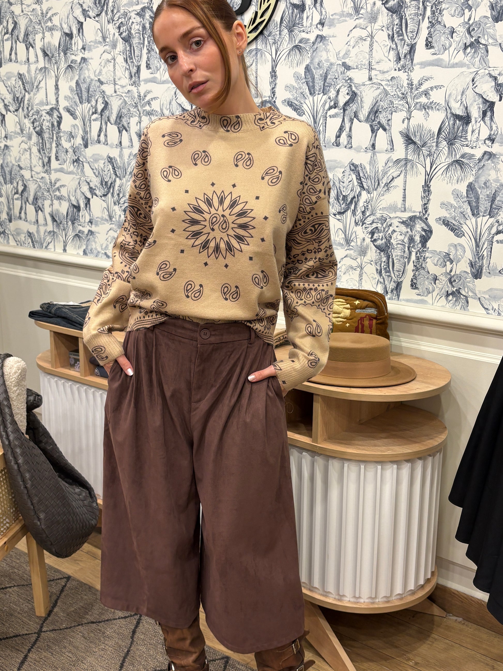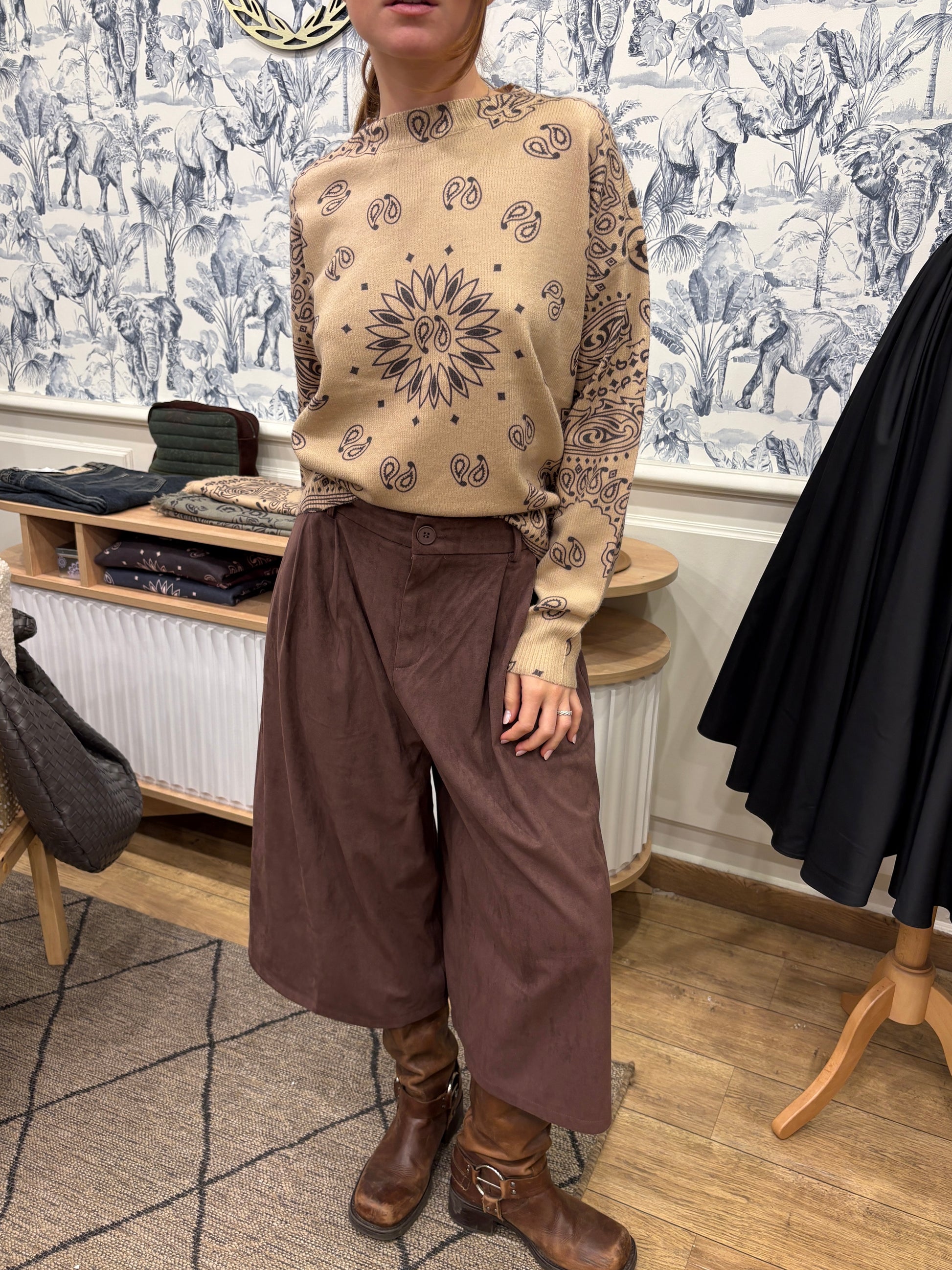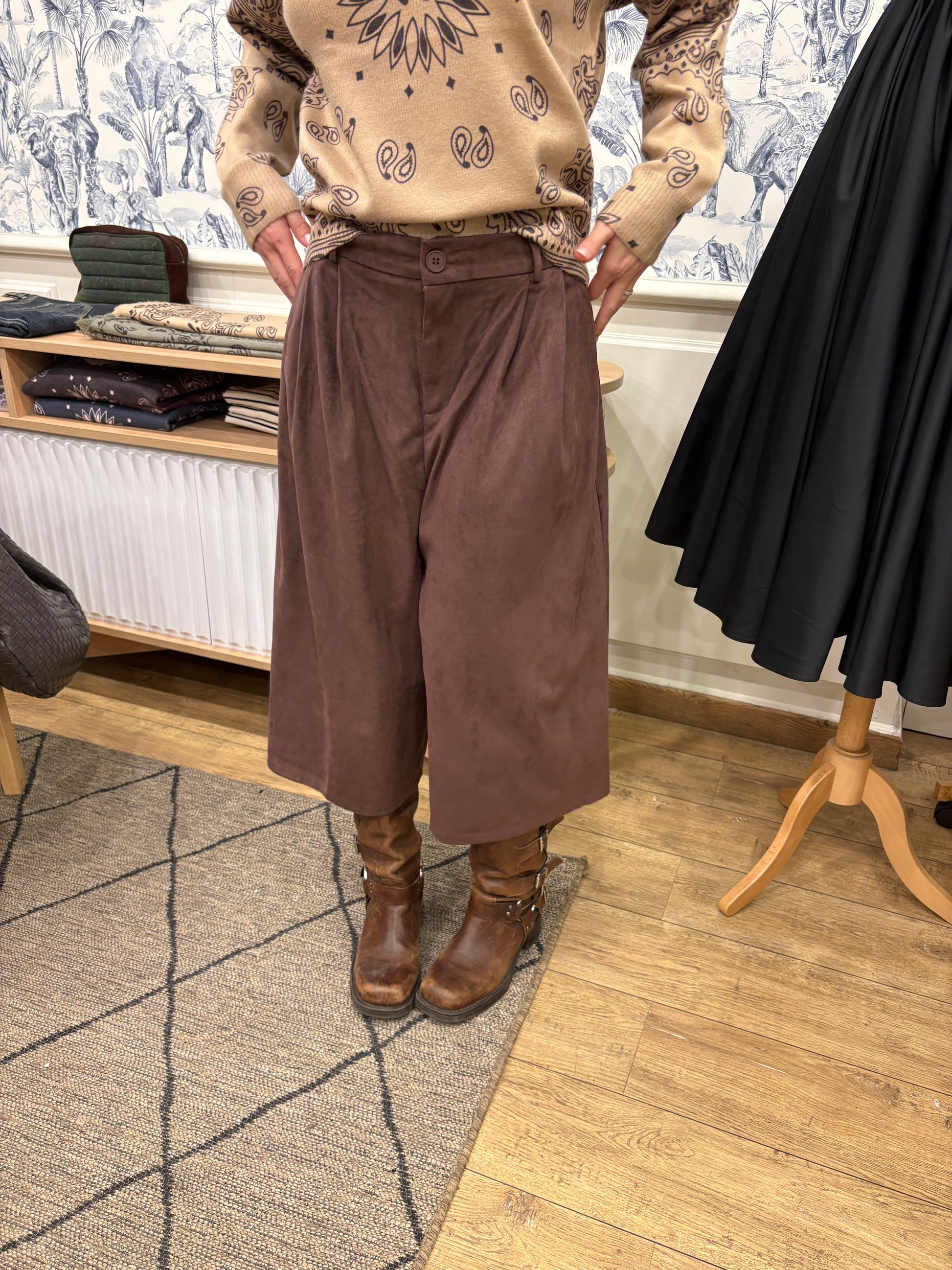 Bermuda long en suédine chocolat, taille haute et coupe large façon jupe-culotte. La ligne est fluide avec de jolies pinces sur le devant, une ceinture montée fermée par bouton et zip, et des poches côtés pour le confort. Sa matière effet daim toute douce lui donne un côté bohème chic, parfait avec des bottes ou des baskets pour un look casual d’hiver.