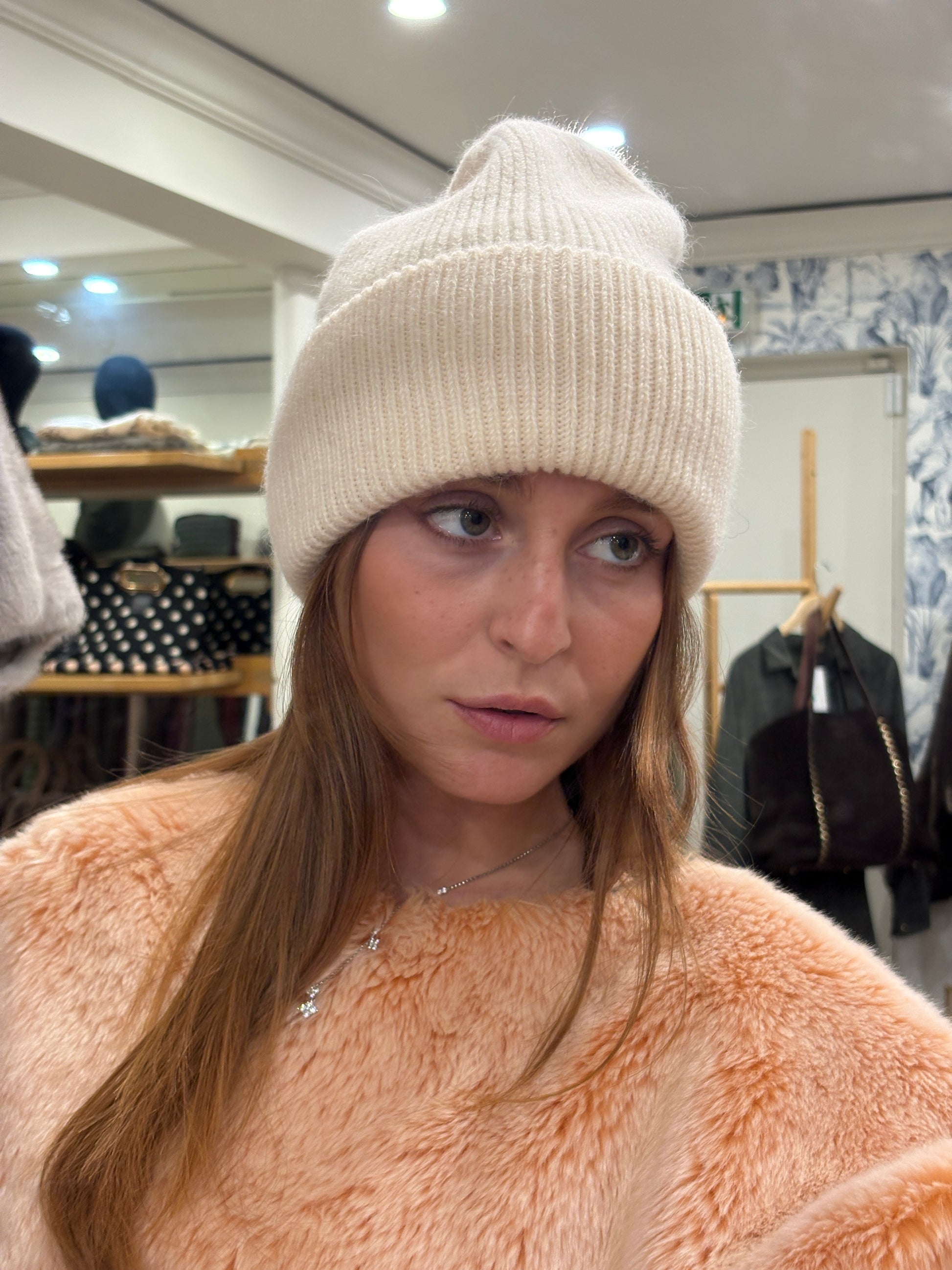 Composé de 50 % nylon, 30 % viscose et 20 % angora, il est léger, confortable et ne gratte pas, avec un bord large et roulé qui enveloppe bien la tête.