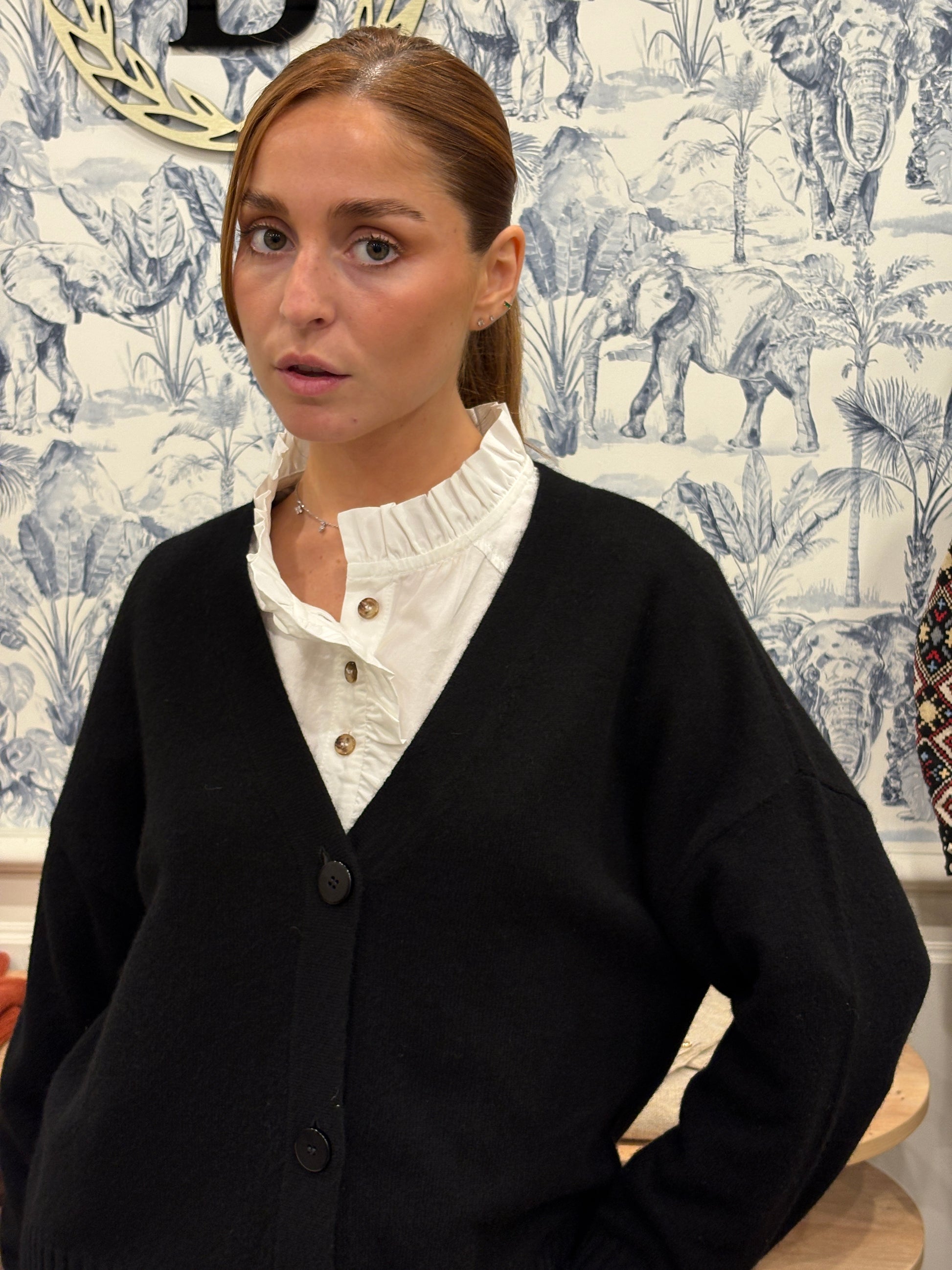 Un essentiel du vestiaire chic et confortable, le cardigan Grammalya allie douceur, simplicité et élégance. Tricoté en maille fine, il séduit par sa coupe droite légèrement oversize et son tombé souple, parfait pour les superpositions de saison.