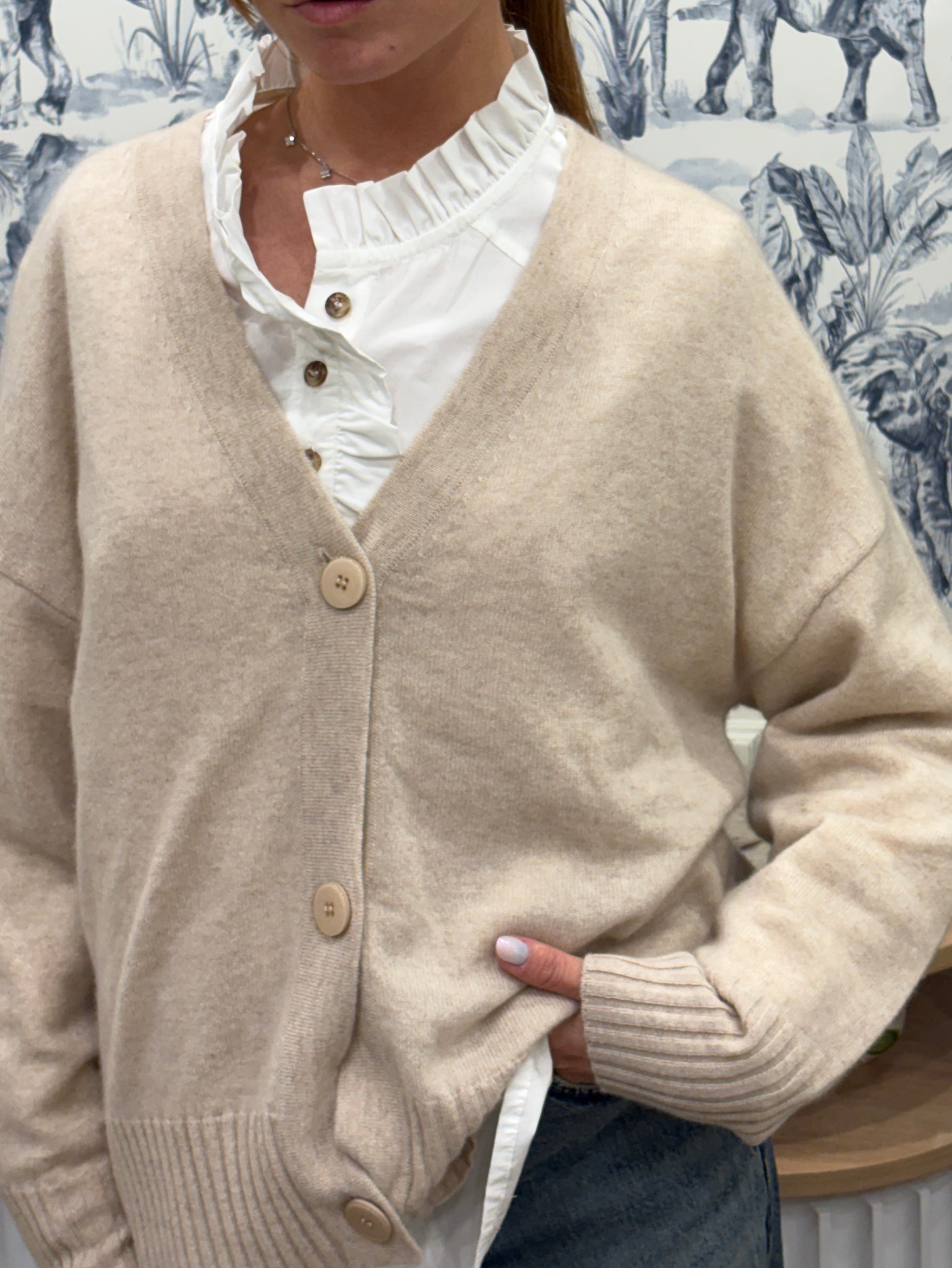 • Détails : encolure en V, boutonnage sur le devant, bords-côtes épais aux poignets et à la base