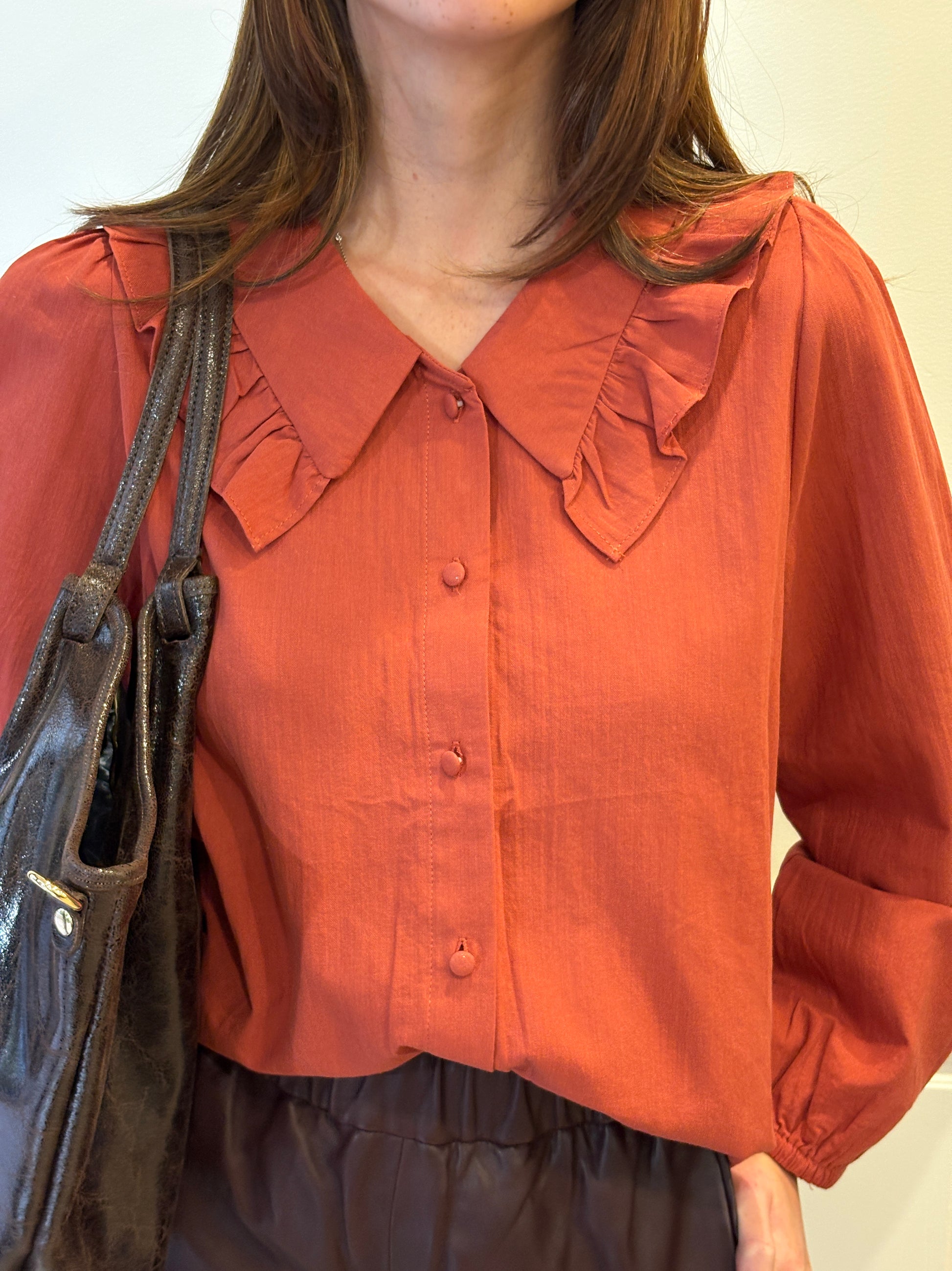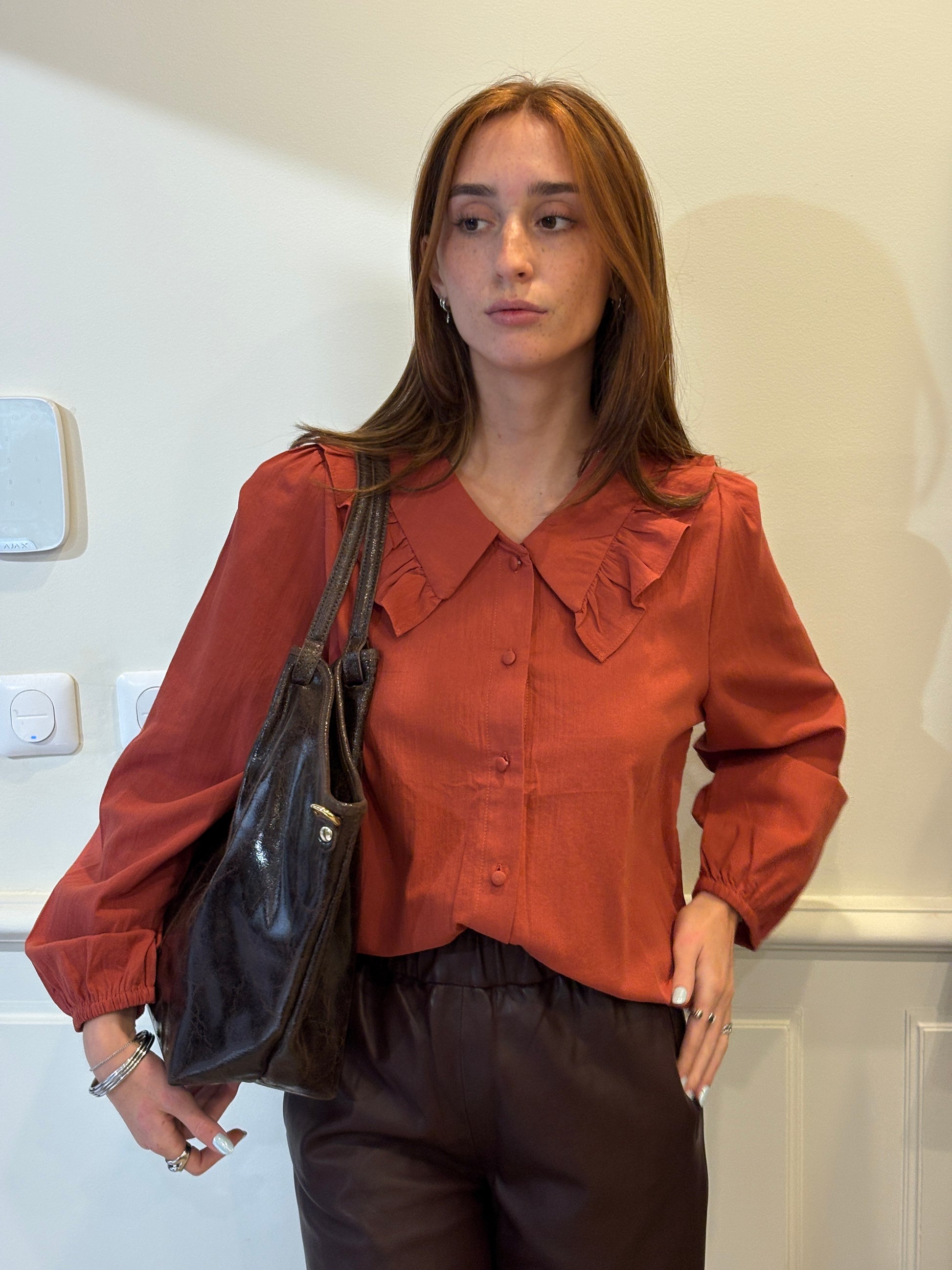 Une pièce féminine et originale qui modernise la chemise classique grâce à son col à volants et ses boutons recouverts. Parfaite pour apporter une touche d’élégance à un look casual comme habillé.