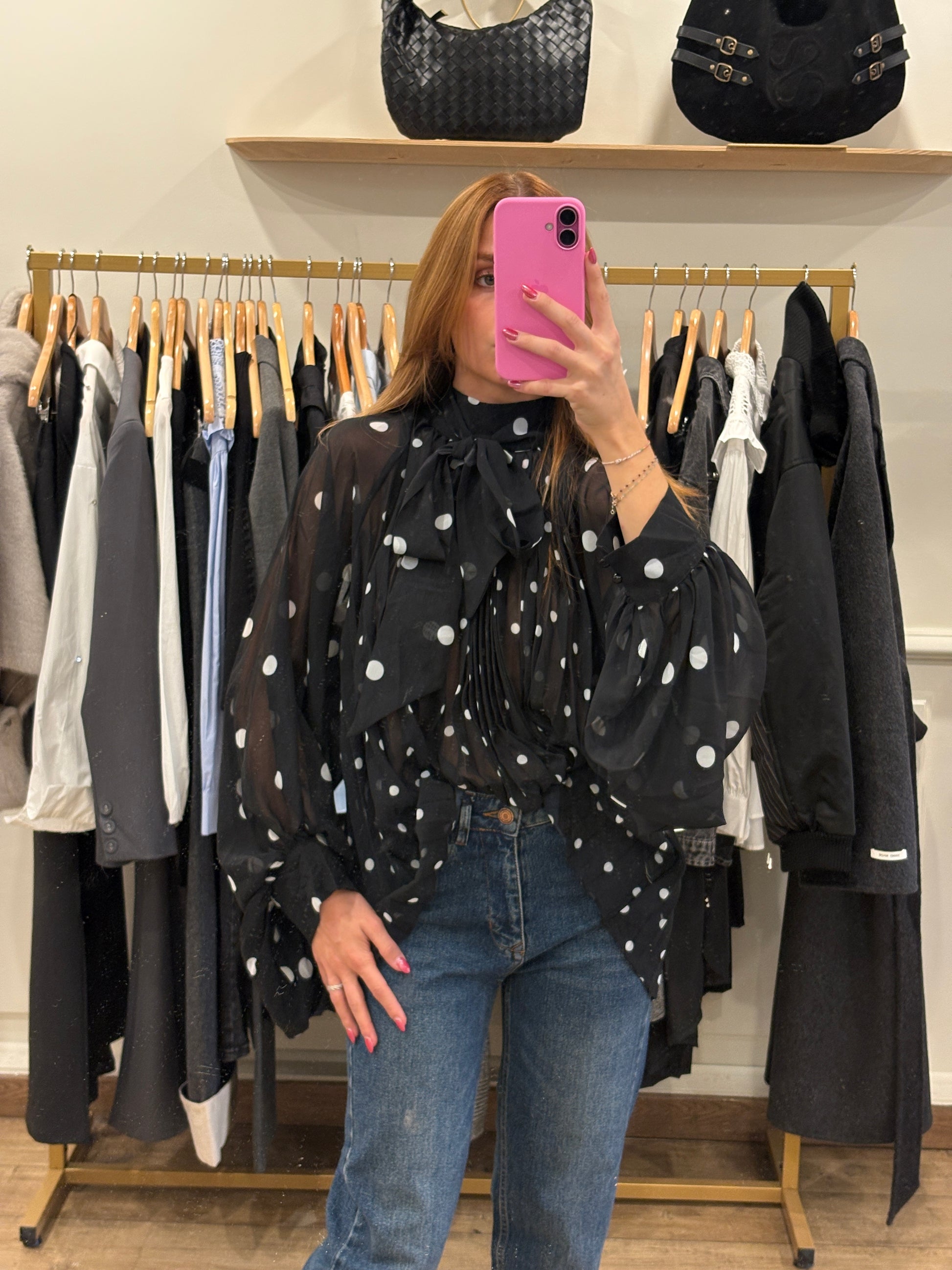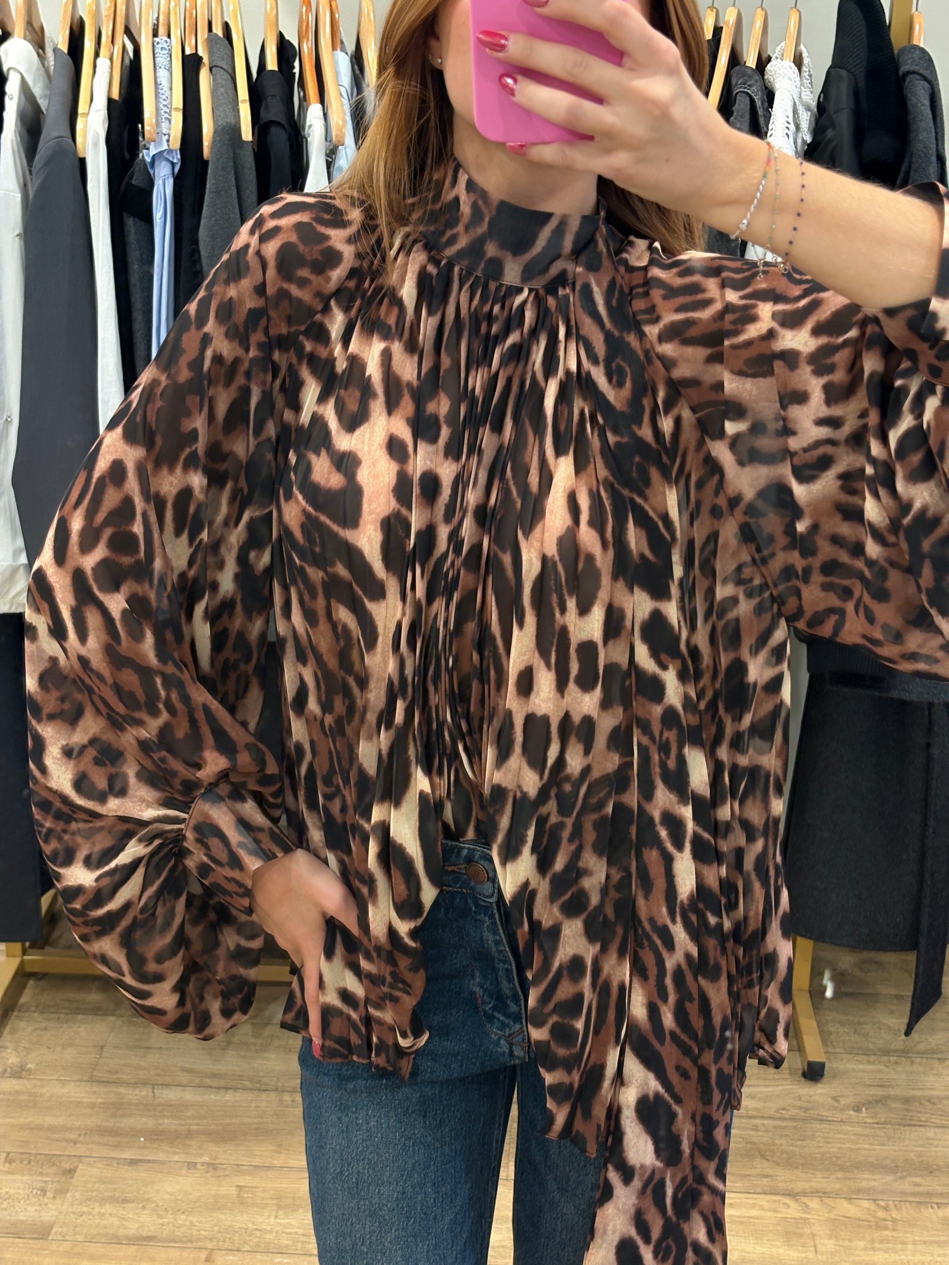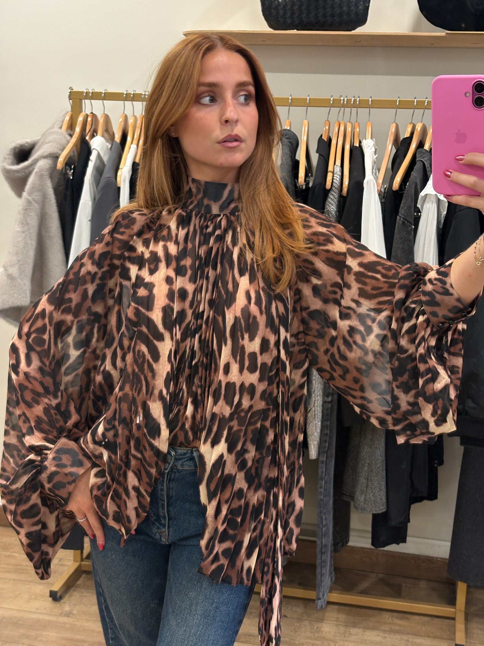 Une blouse fluide et audacieuse, disponible en deux versions : pois chic ou imprimé léopard sauvage. Légère et vaporeuse, elle séduit par son tombé élégant et sa coupe ample qui sublime la silhouette.