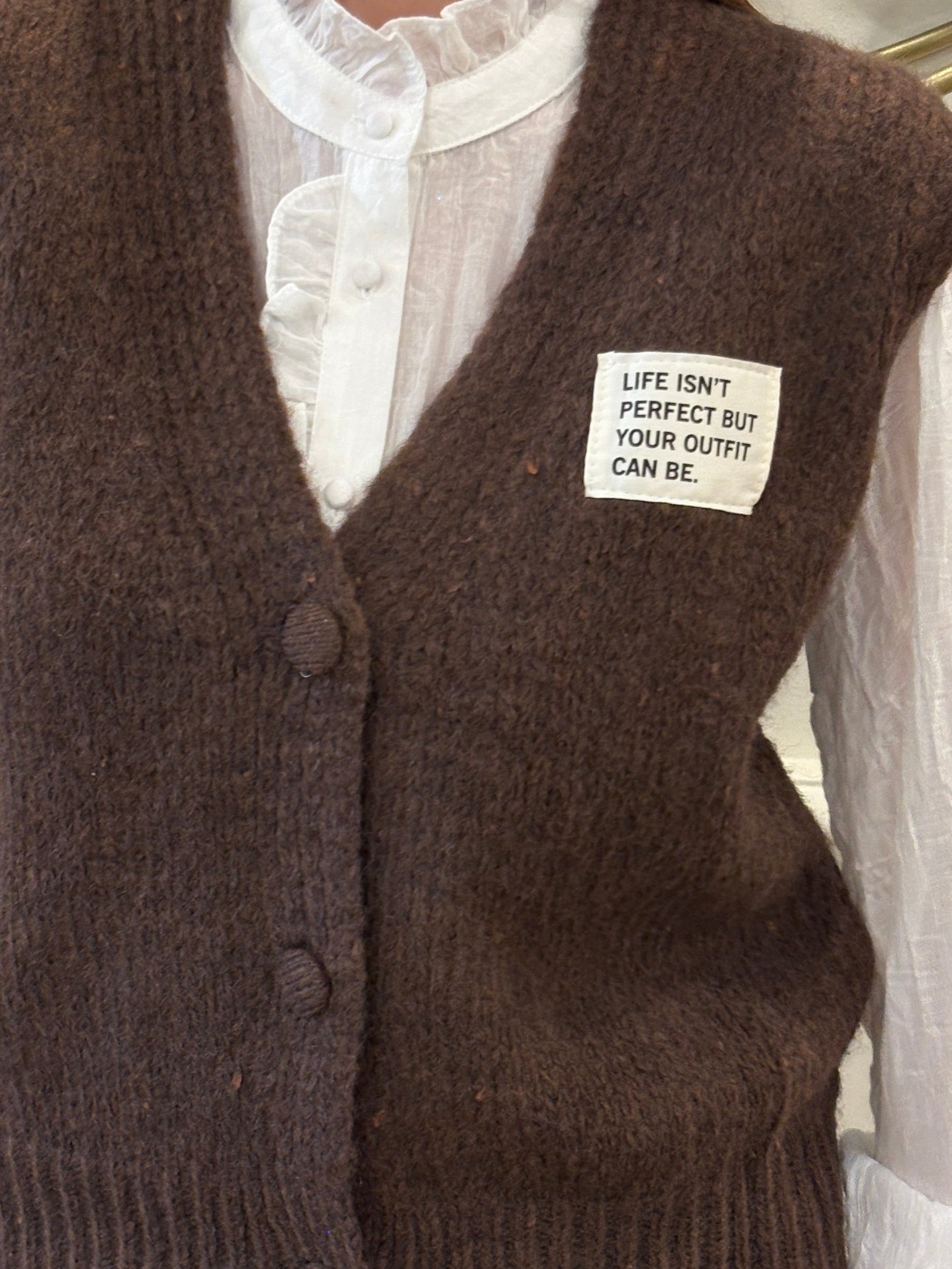 Détails : col V, boutonnage ton sur ton, patch contrastant à message “Life isn’t perfect but your outfit can be.”
