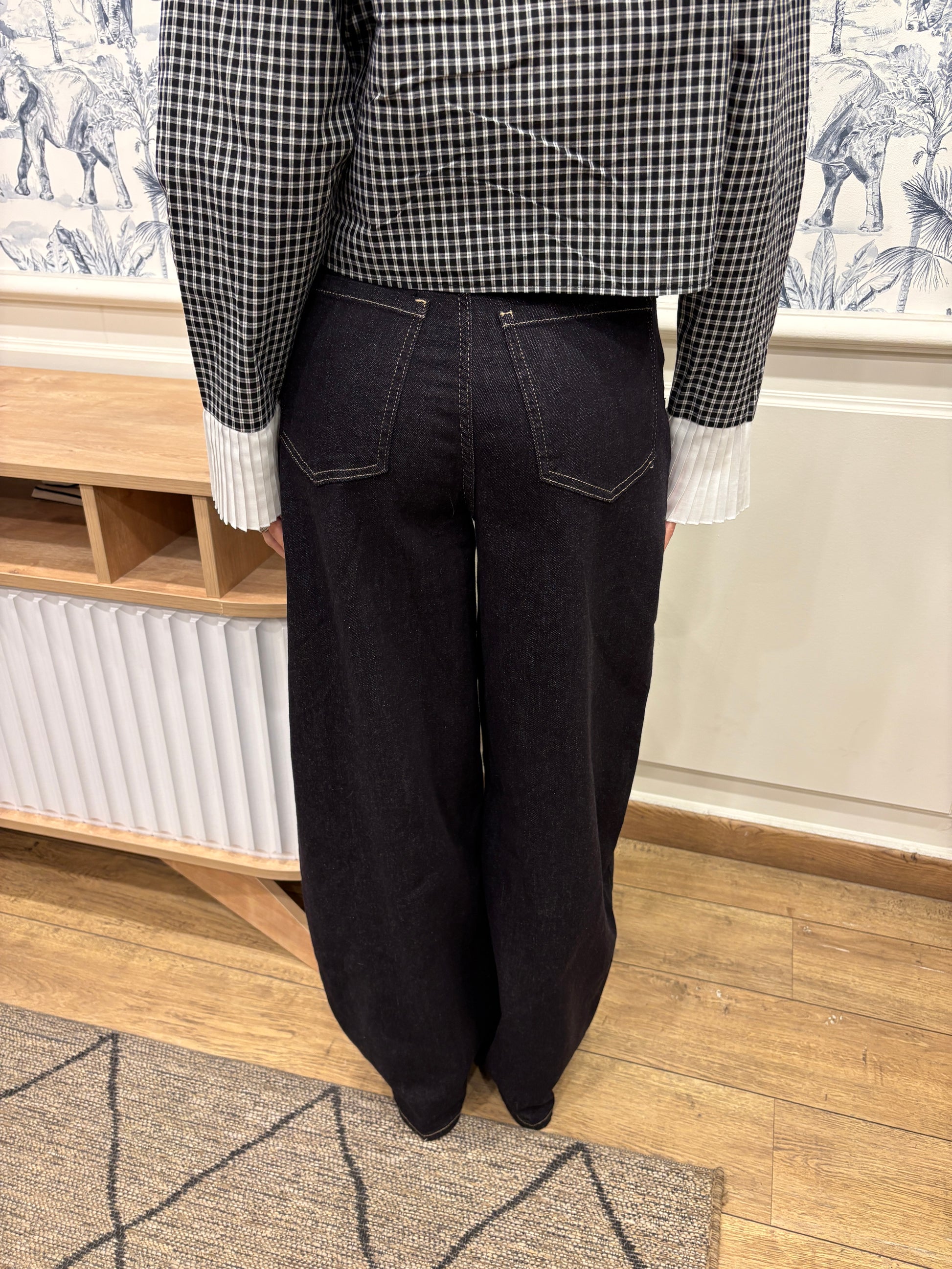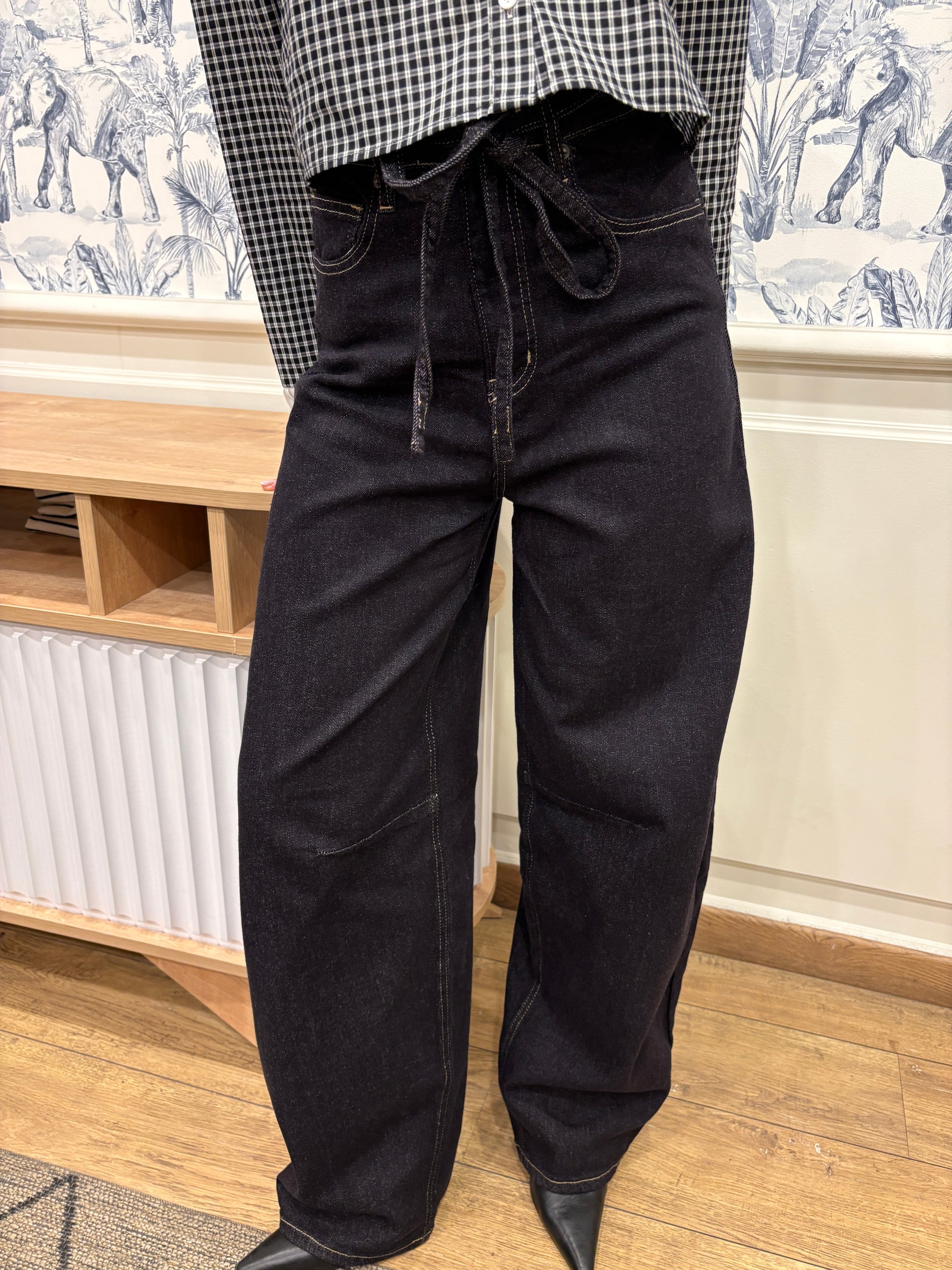 La ceinture est montée façon paperbag avec un lien à nouer ton sur ton, qui marque joliment la taille. Les jambes sont amples et droites, avec de grandes surpiqûres contrastées qui lui donnent un côté workwear chic. Un jean fort qui se porte aussi bien avec une chemise habillée qu’avec un simple t-shirt pour une silhouette moderne et allongée.