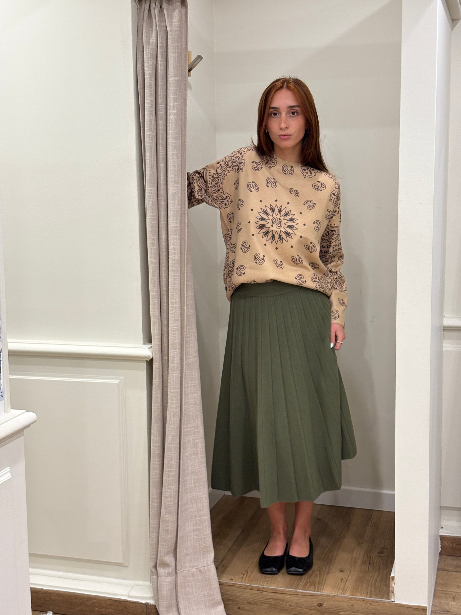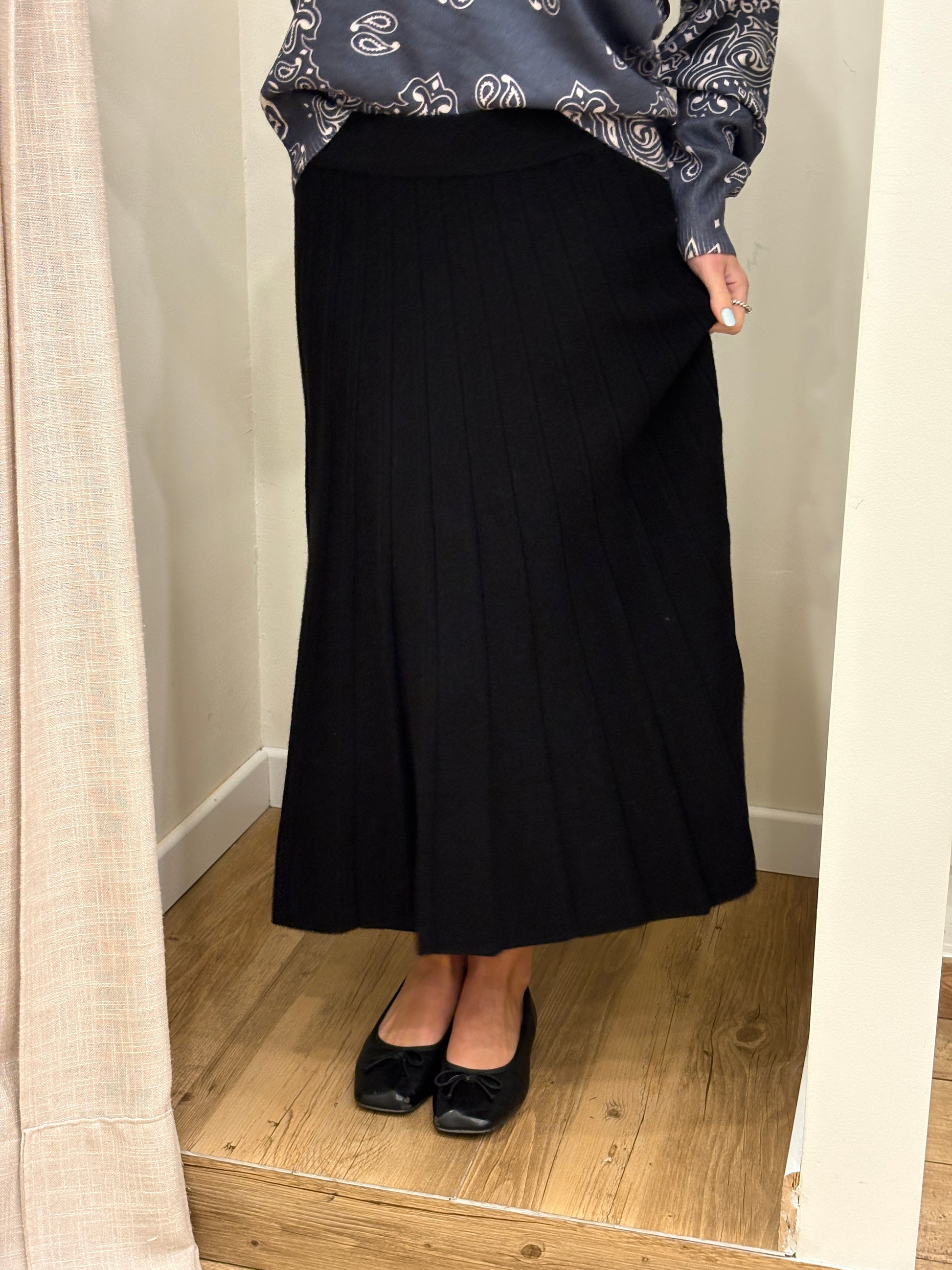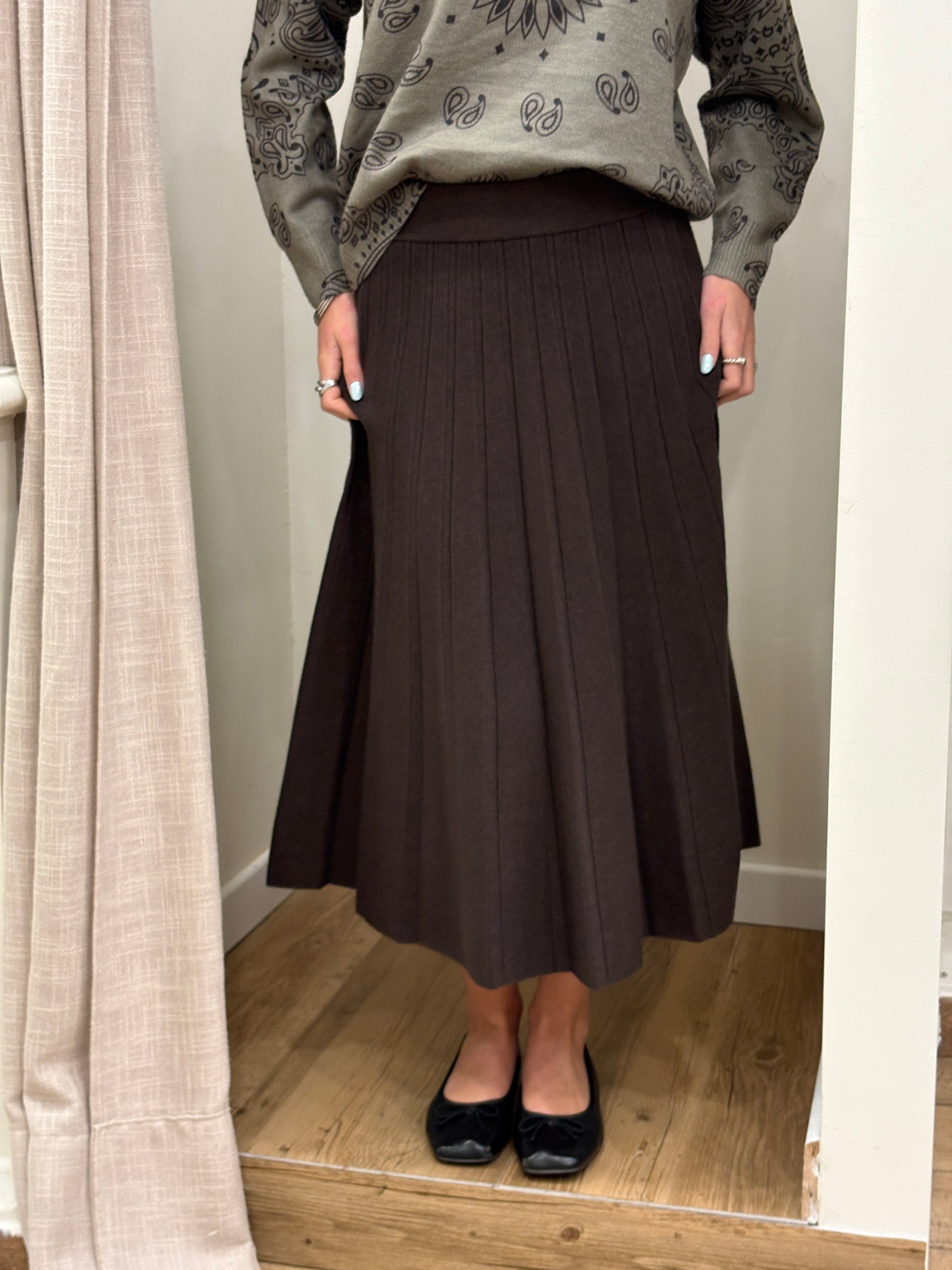 Une jupe midi plissée, à la fois élégante et facile à porter. Son tombé fluide et sa taille élastiquée en font une pièce confortable, idéale pour un look chic au quotidien.
