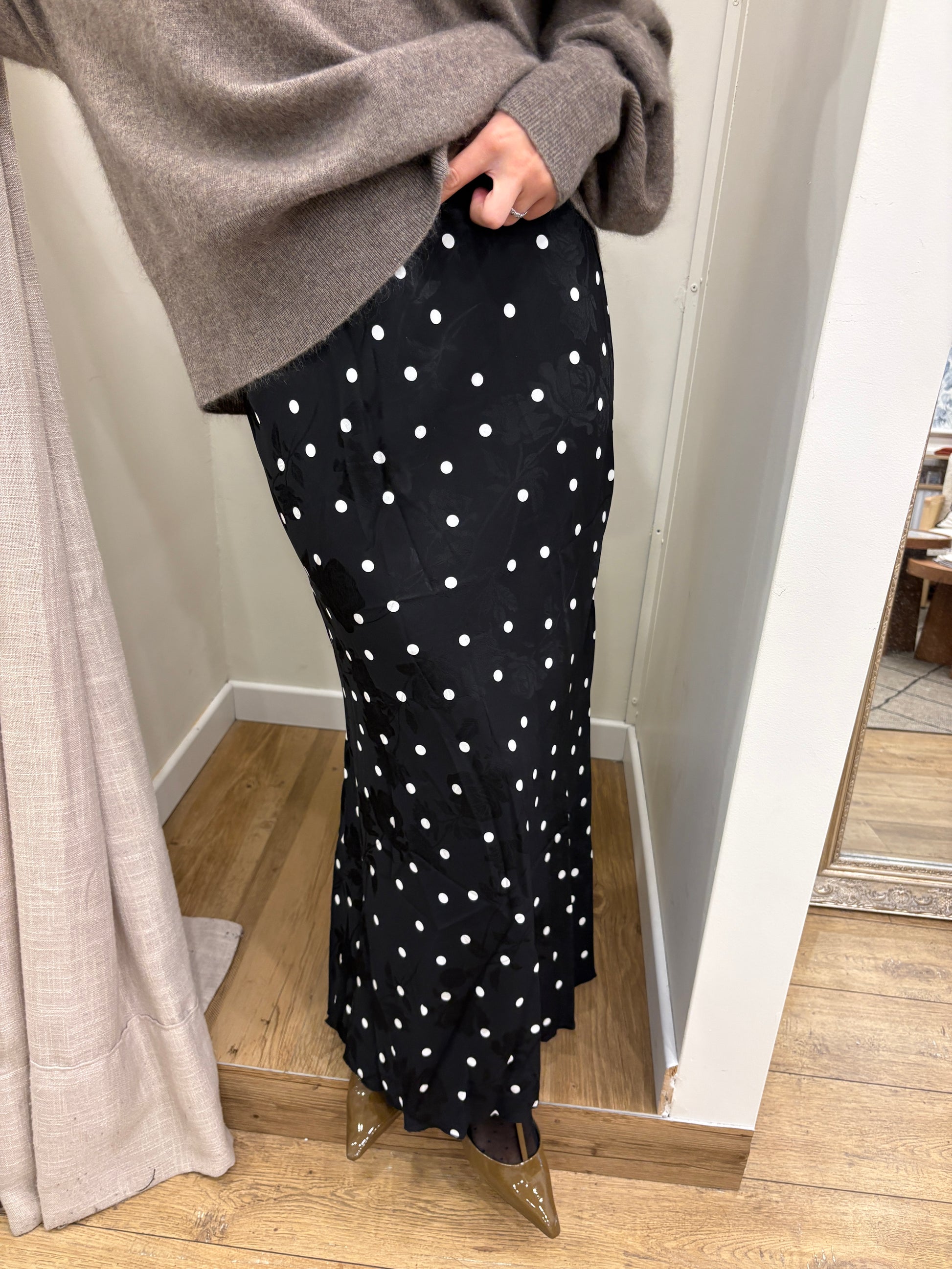Une pièce féminine et intemporelle avec cette jupe longue à pois. Sa coupe fluide épouse délicatement la silhouette et son tissu satiné apporte une touche d’élégance subtile à chaque mouvement.