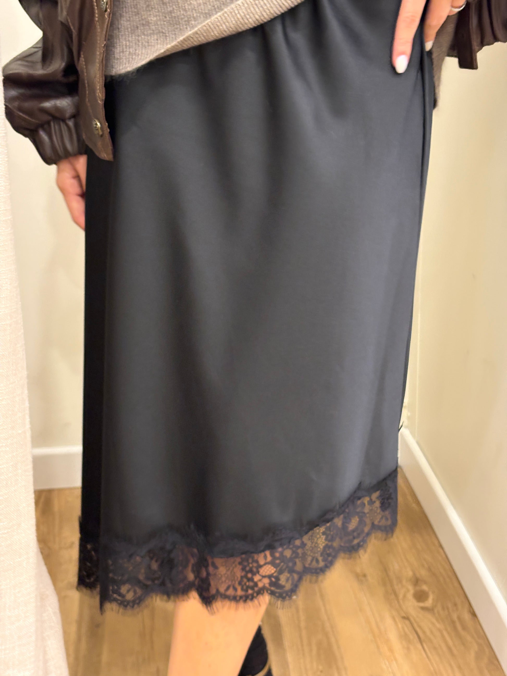 Féminine et raffinée, cette jupe satinée noire se distingue par sa finition délicate en dentelle qui sublime le bas du vêtement. Sa coupe fluide et sa taille élastiquée offrent un confort optimal tout en dessinant une silhouette élégante et naturelle.
