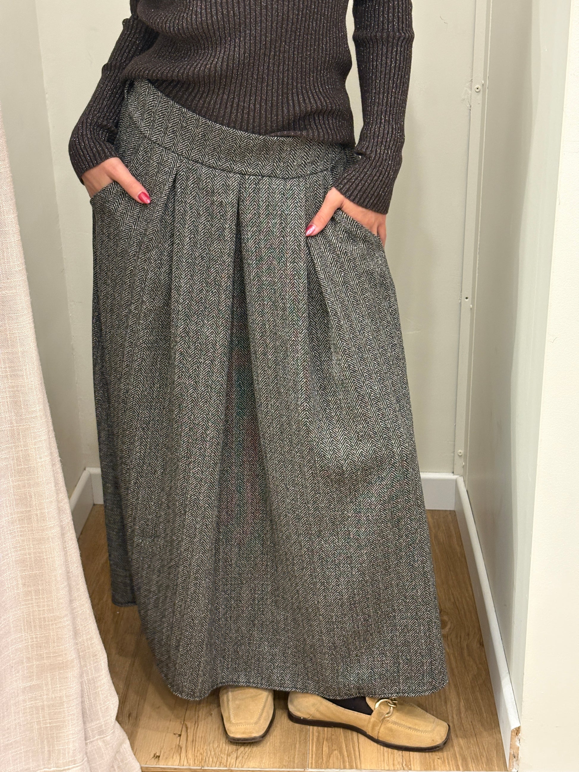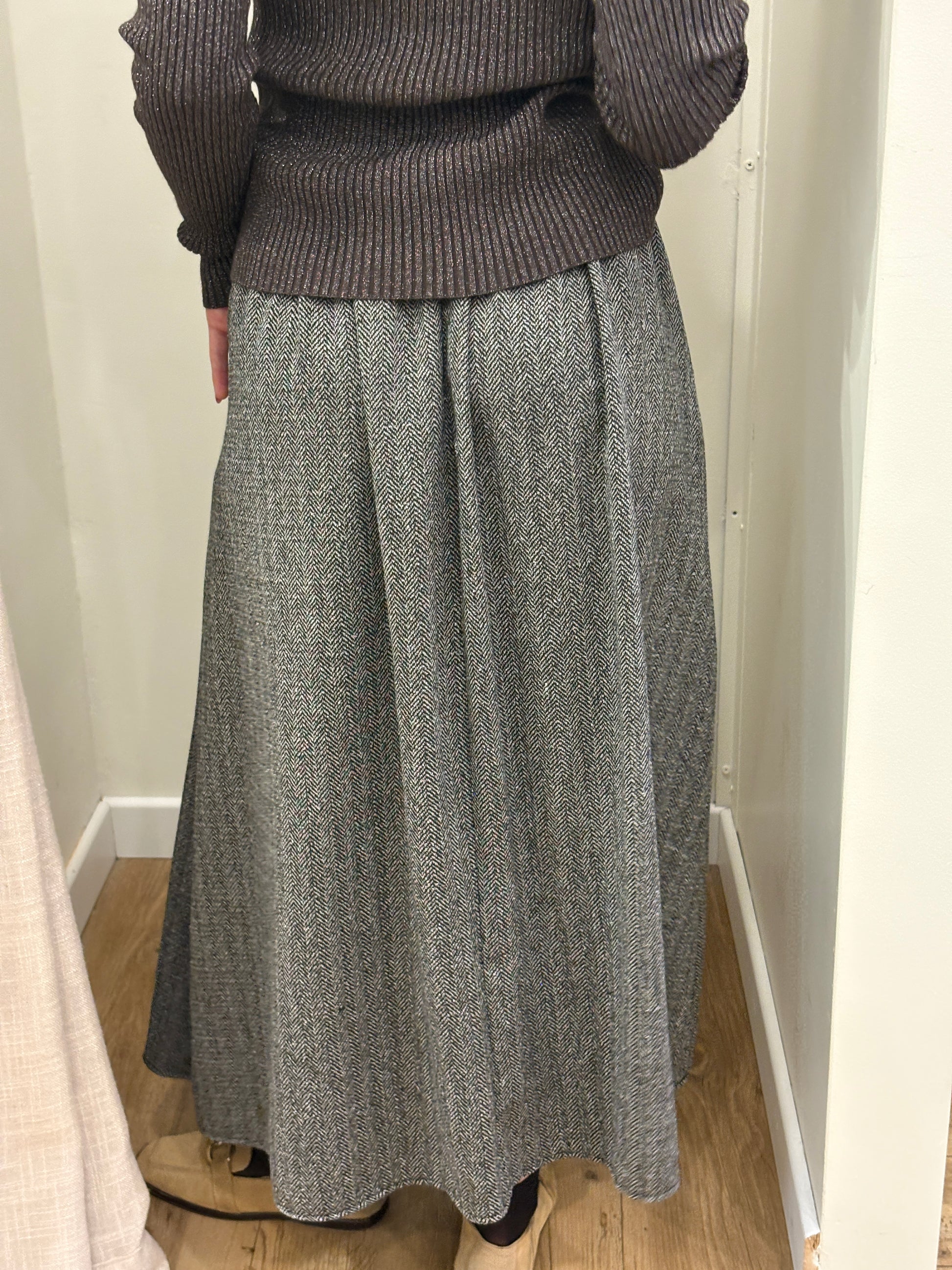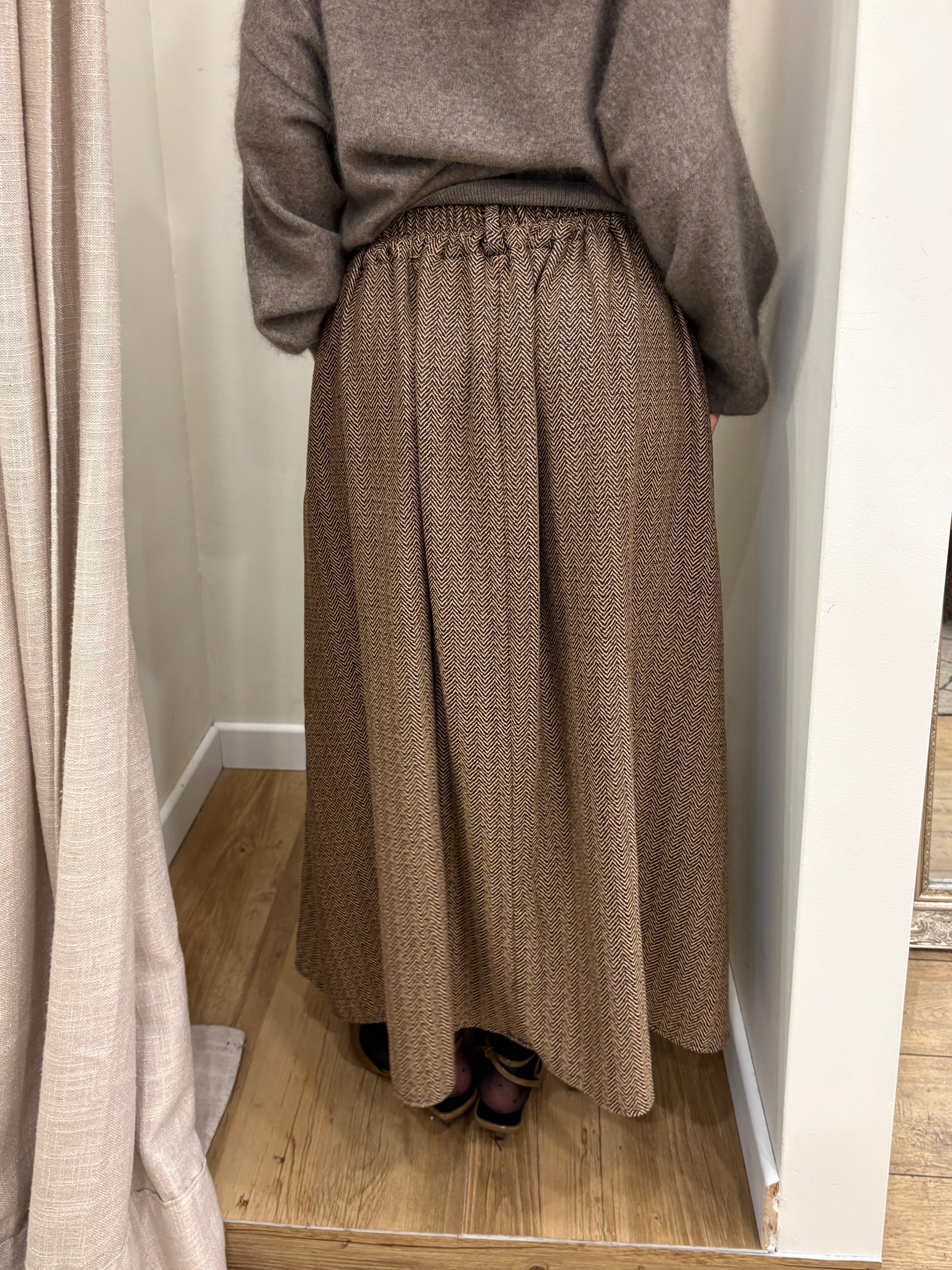 Une allure élégante et intemporelle avec cette jupe ceinturée en tissu chevron. Son tombé fluide et sa ceinture ton sur ton soulignent la taille avec finesse pour un look chic et confortable.