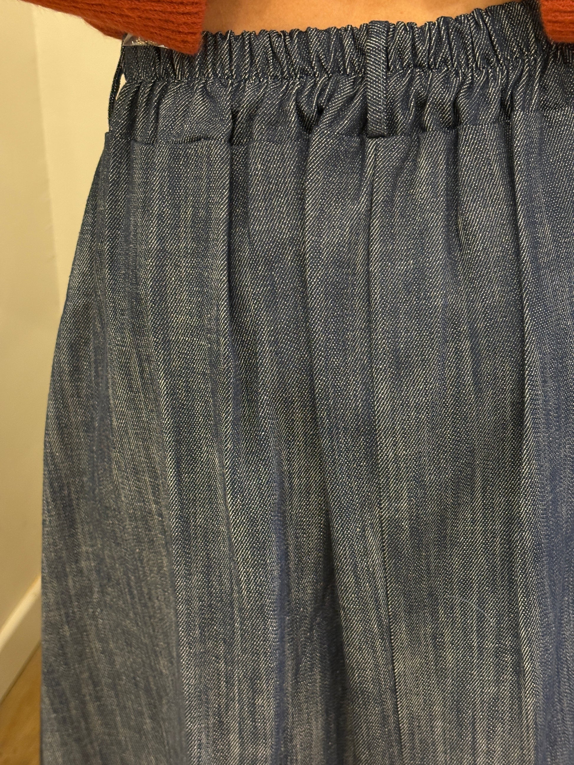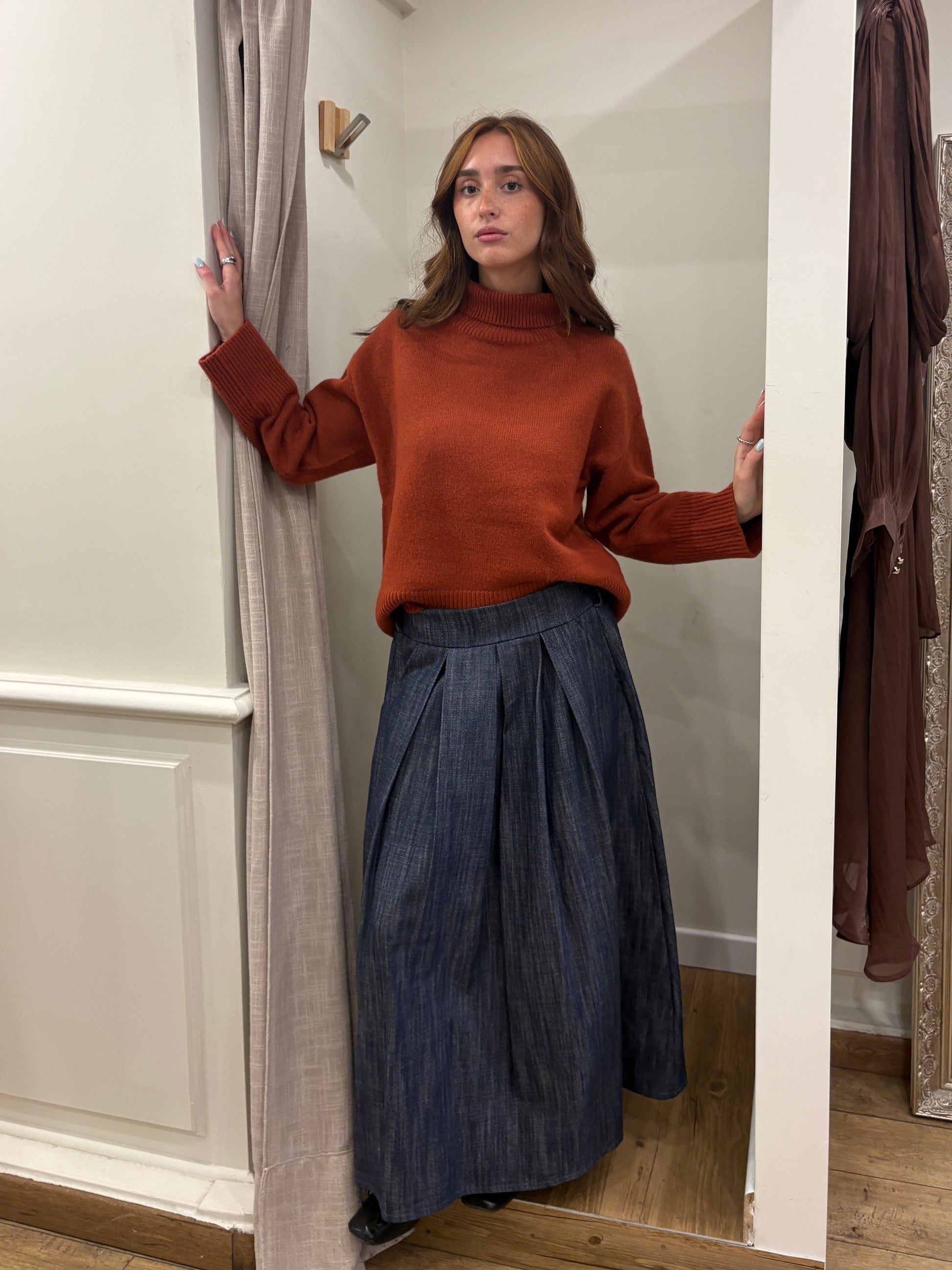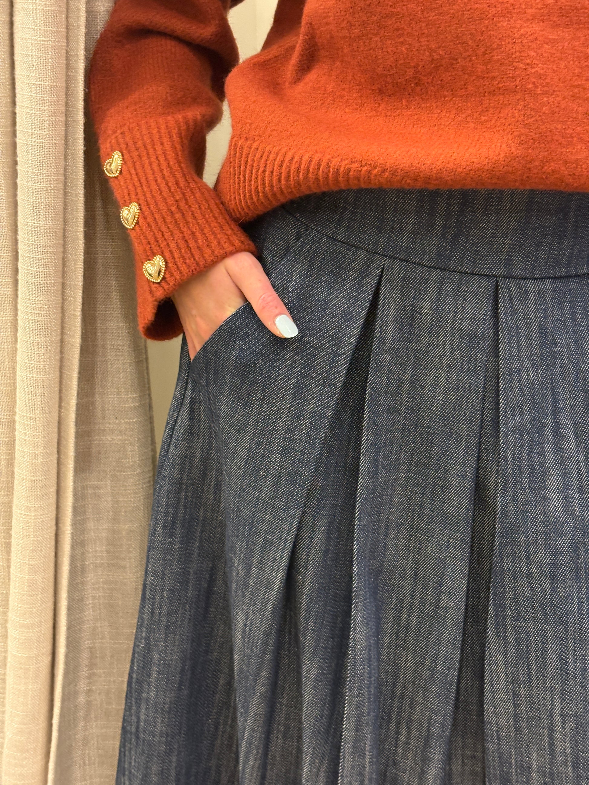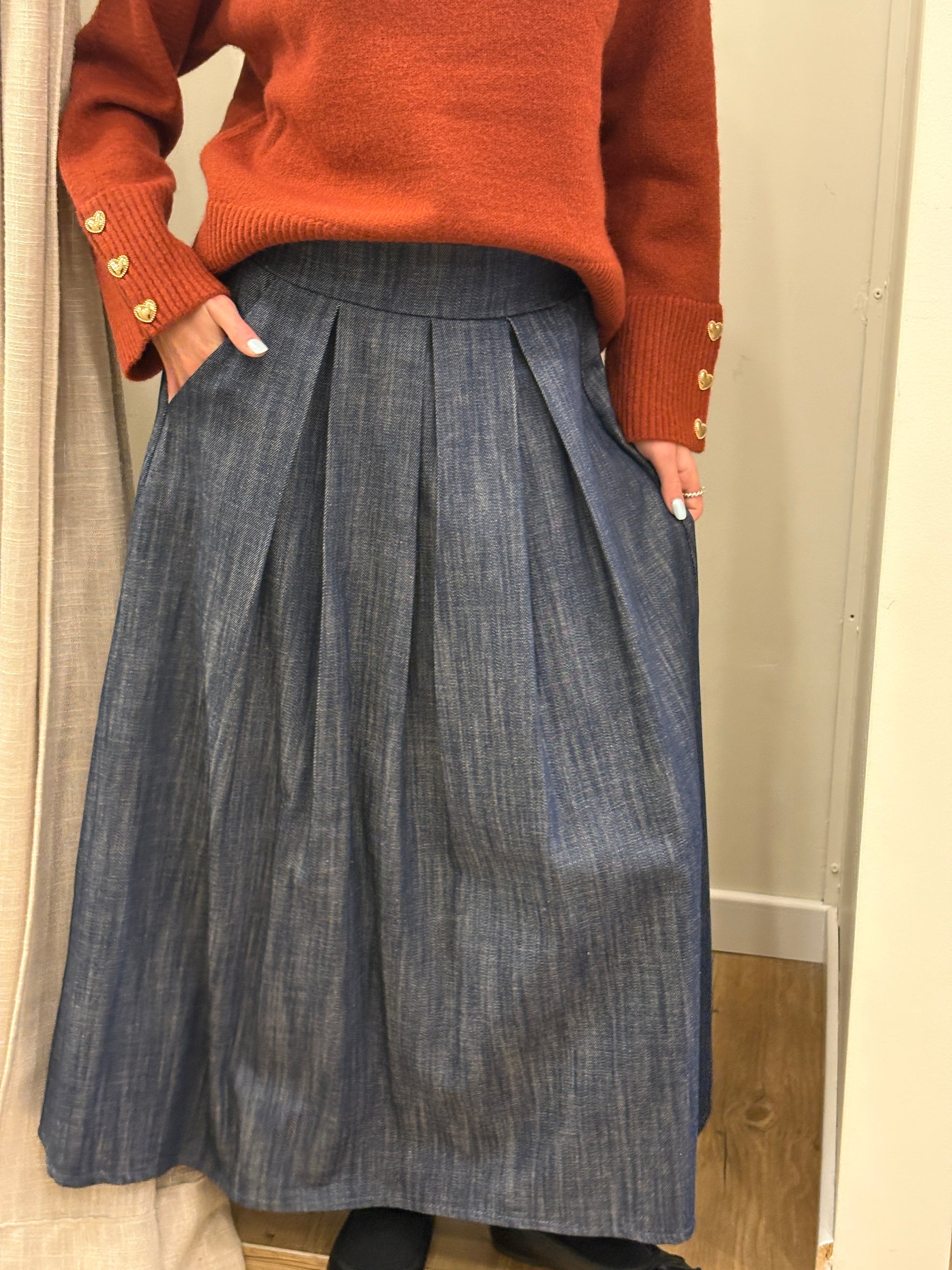 Une jupe longue en denim à l’élégance naturelle et au charme intemporel. Sa coupe structurée et ses plis marqués soulignent une allure féminine et raffinée.