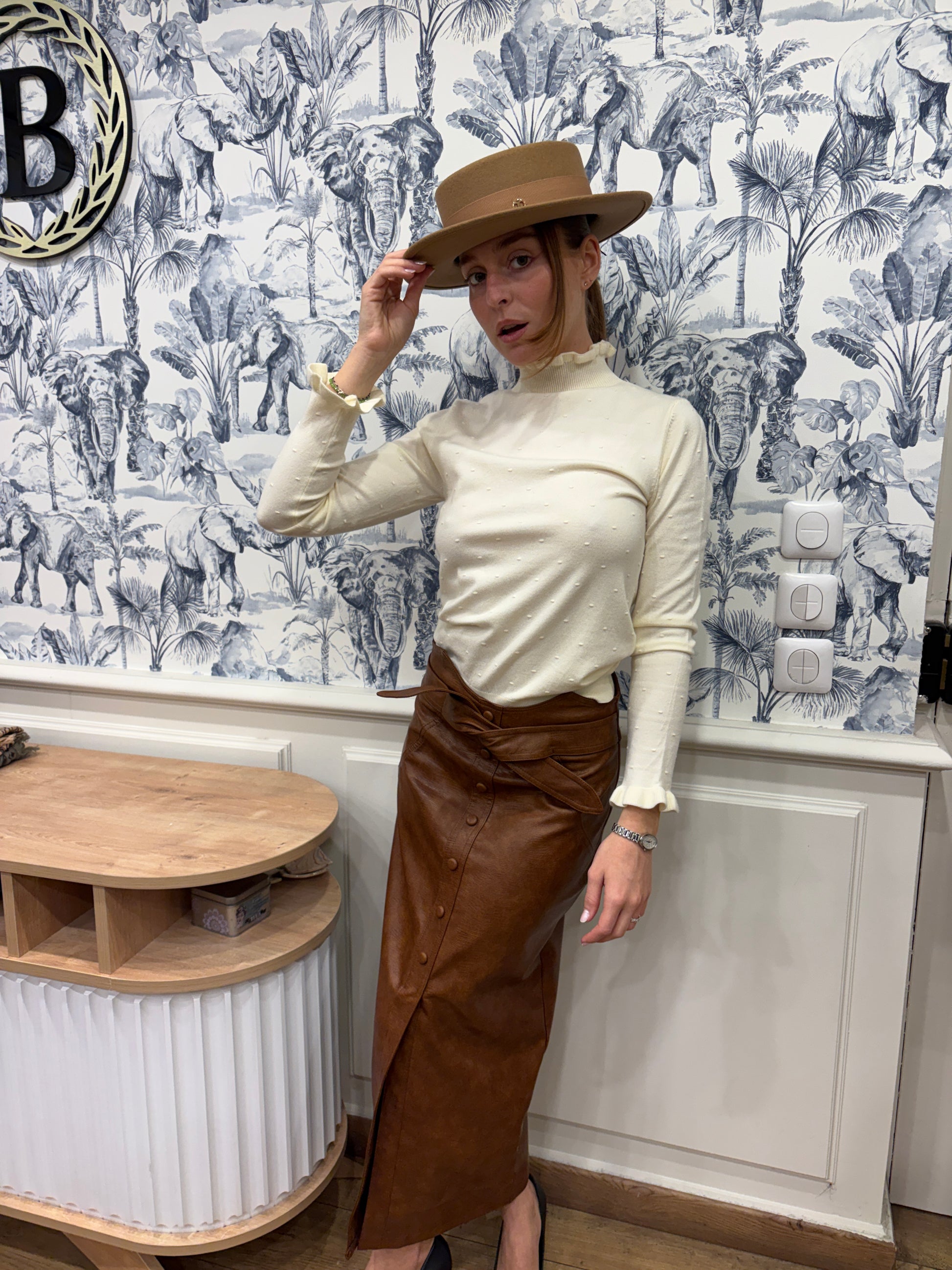 Jupe midi en faux cuir camel, ultra élégante avec une touche rétro.