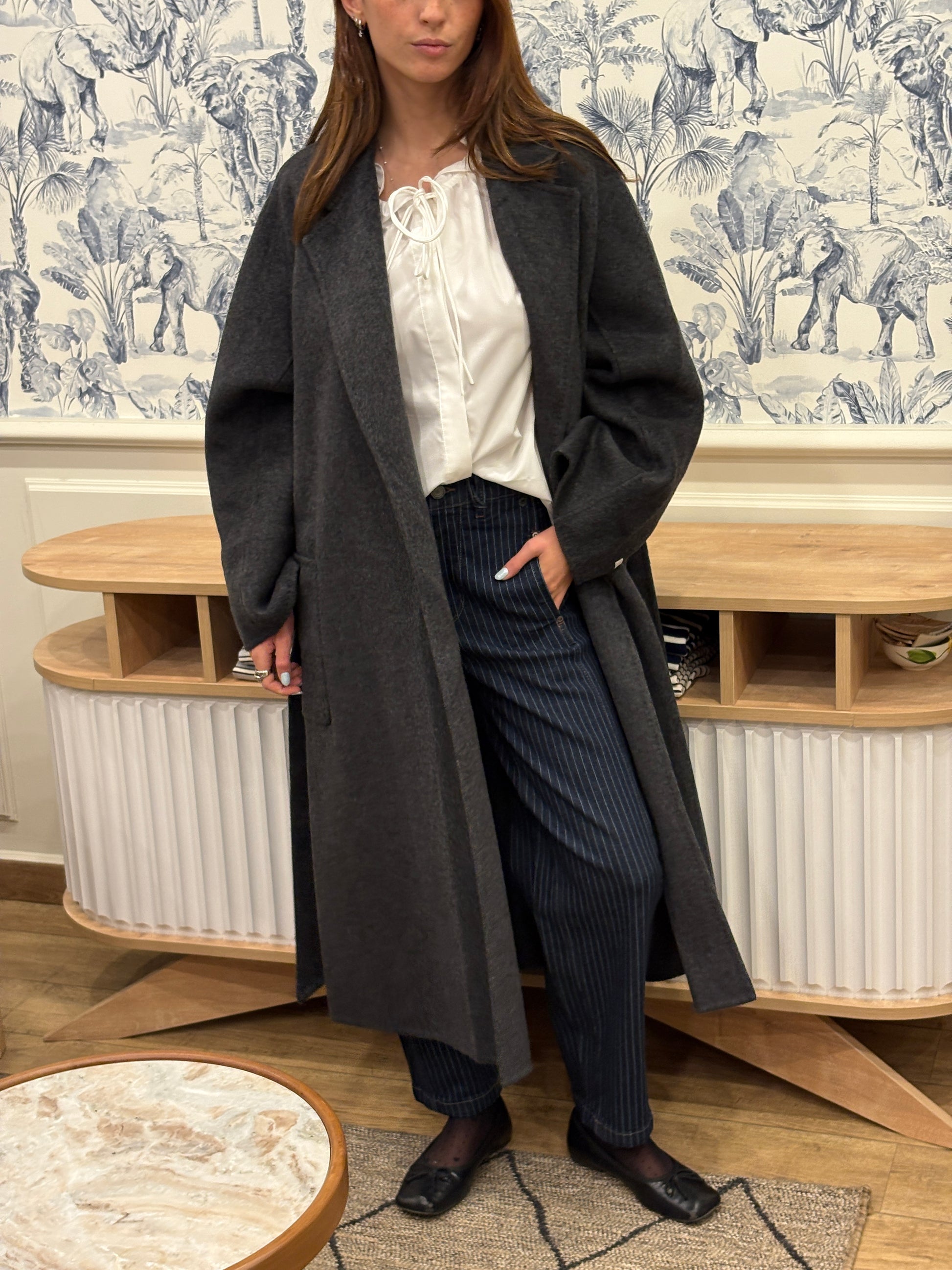 Un manteau long ceinturé à l’allure intemporelle, conçu dans une laine chaude et raffinée. Sa coupe ample et son col tailleur en font une pièce élégante et confortable, idéale pour l’hiver.