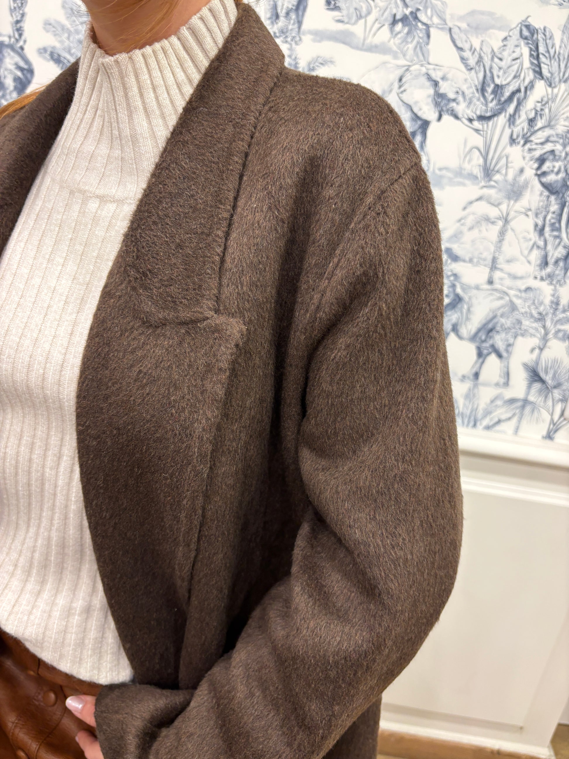 Manteau long croisé en laine chocolat, chaud et ultra élégant.