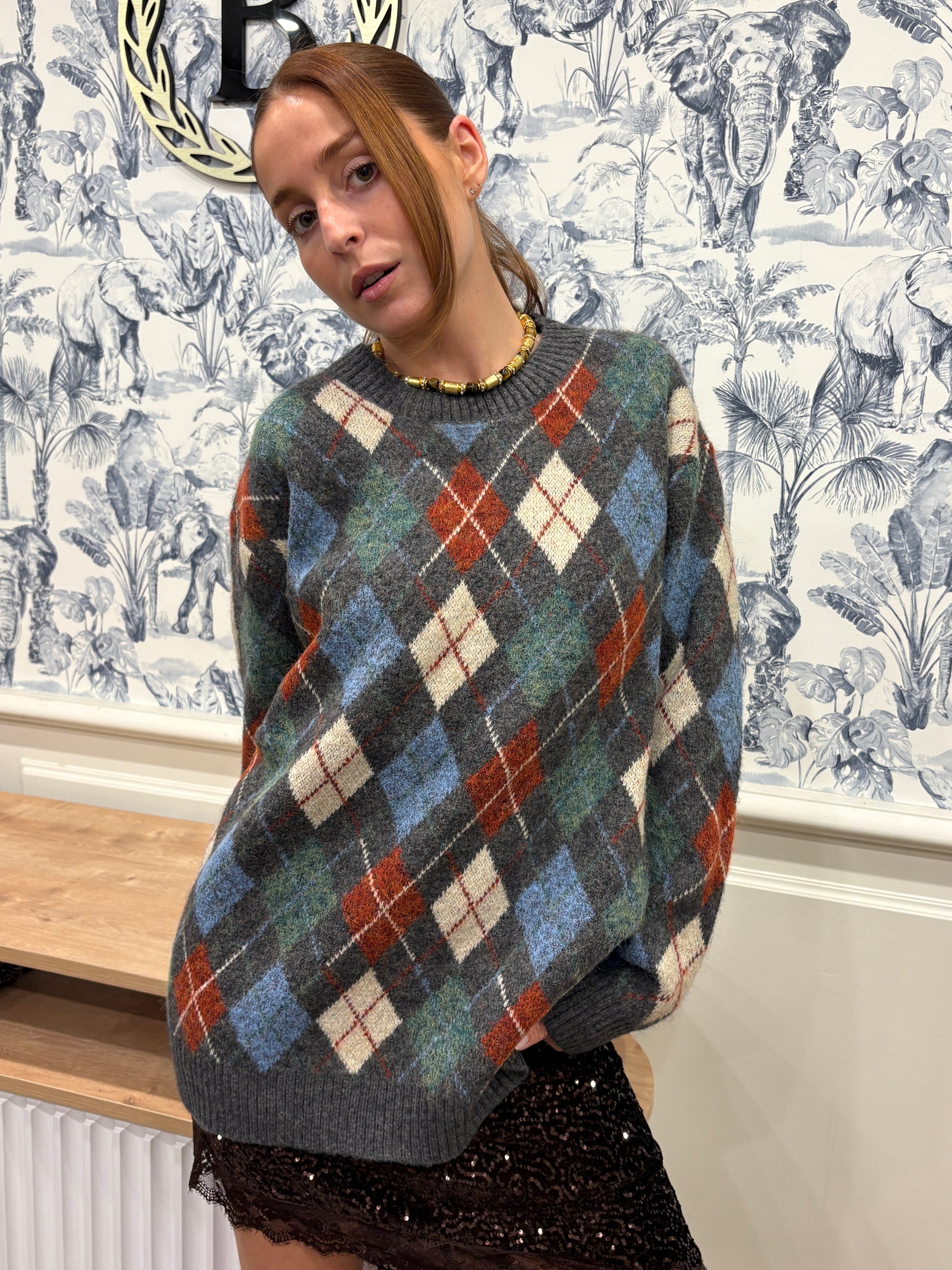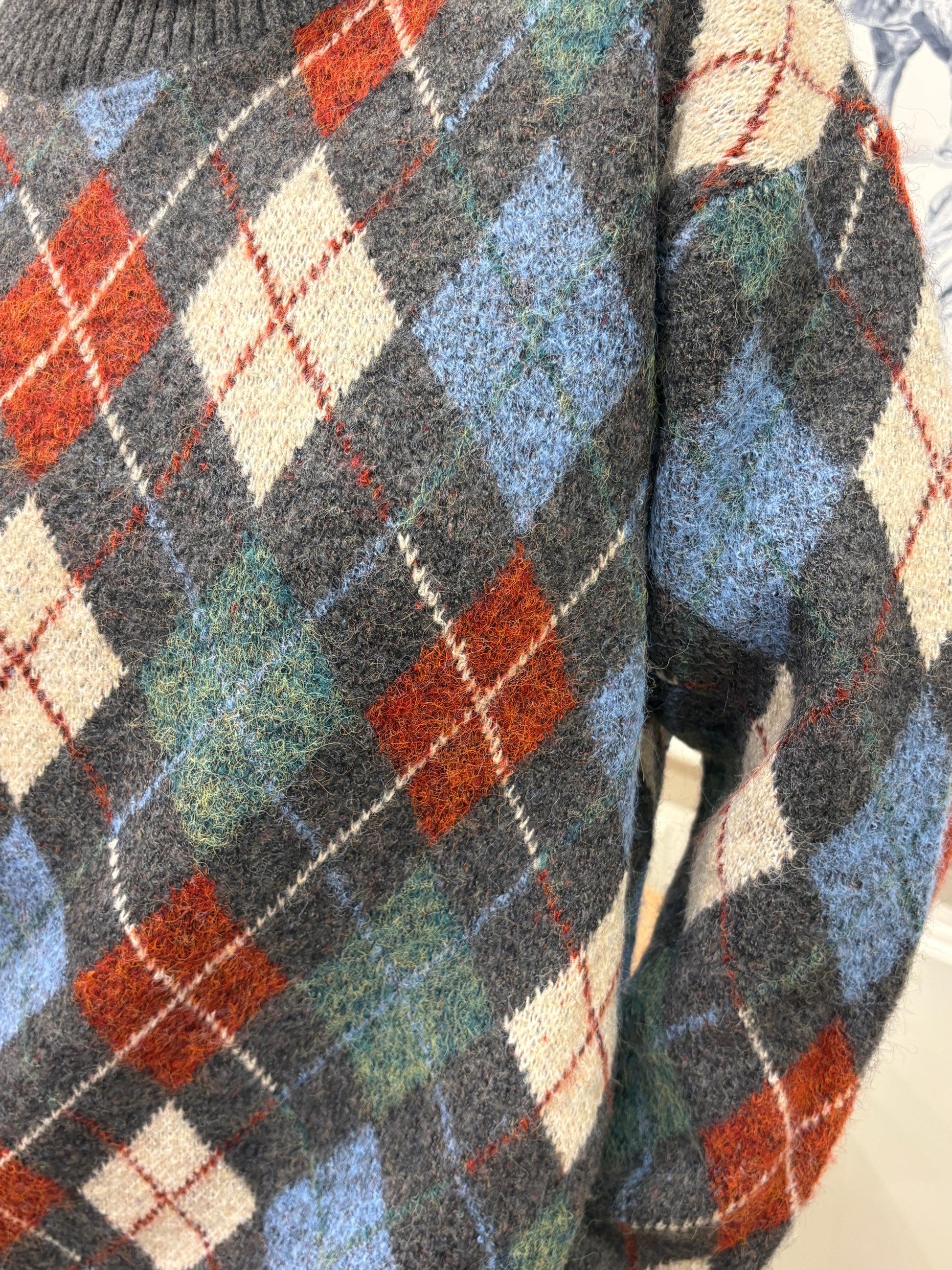 Sa maille duveteuse, en mélange contenant de l’alpaga, est douce et chaude, avec une coupe ample légèrement oversize qui tombe sur les hanches. Le motif losanges dans des tons gris, bleu, vert et brique lui donne un charme rétro, facile à porter aussi bien avec un jean qu’avec une jupe plus habillée pour casser les codes.