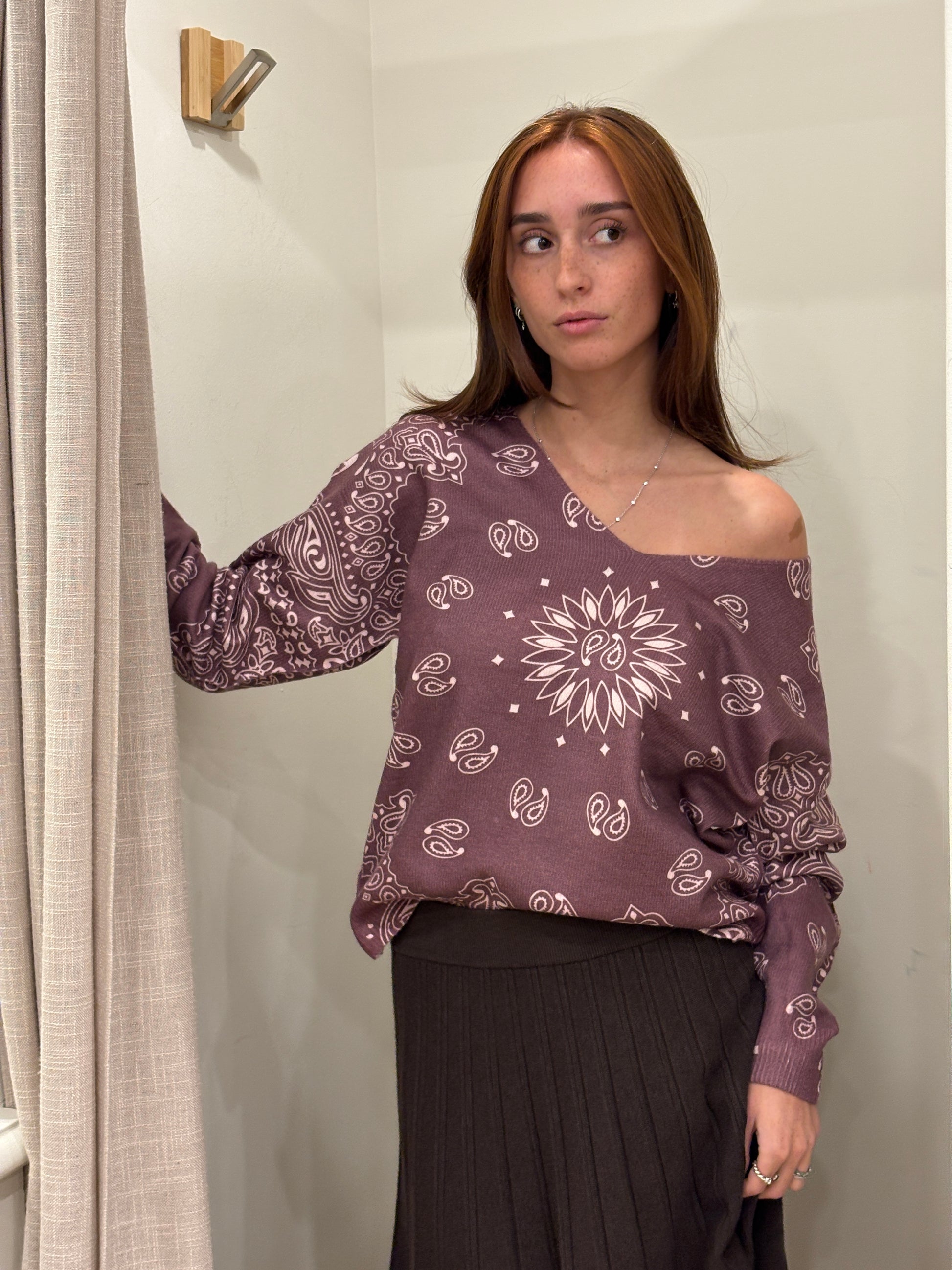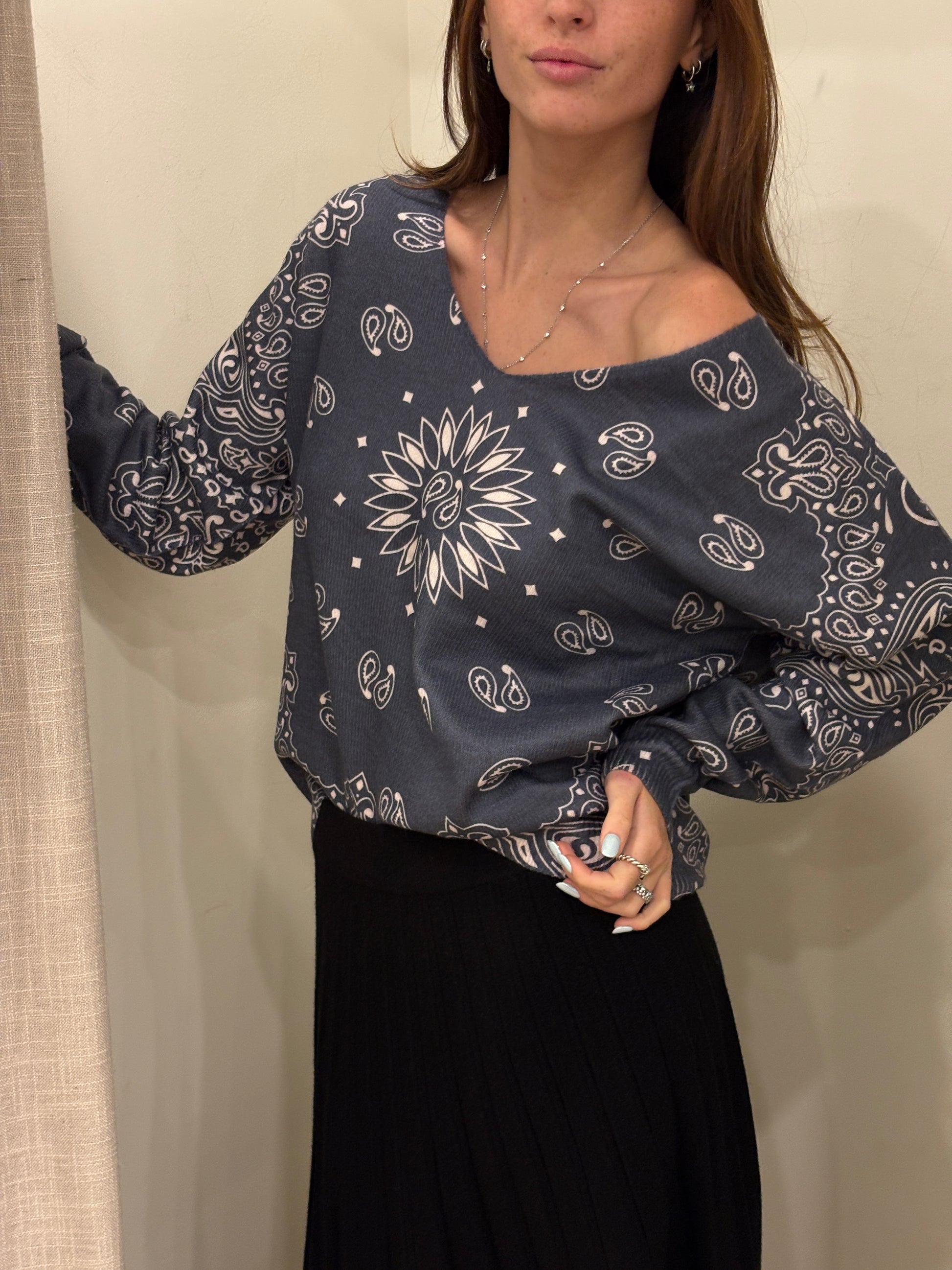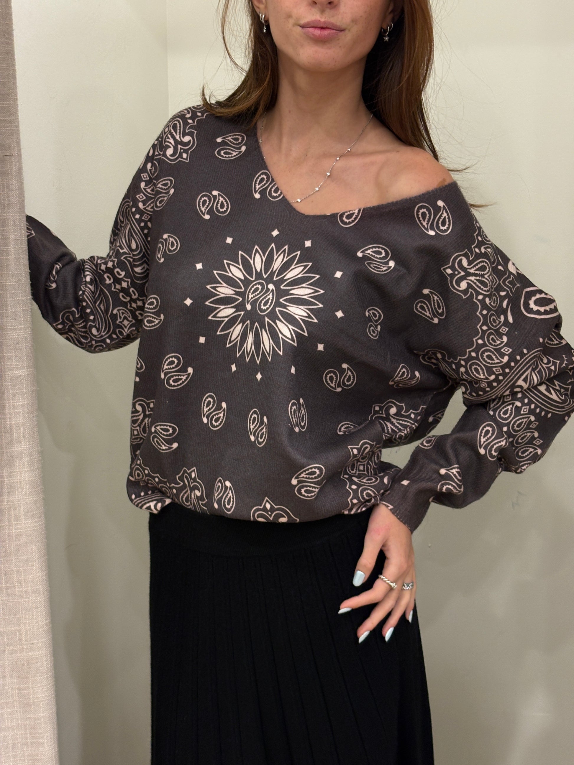 Un pull à col V moderne et graphique, orné d’un motif cachemire façon bandana qui lui donne une allure originale et tendance.