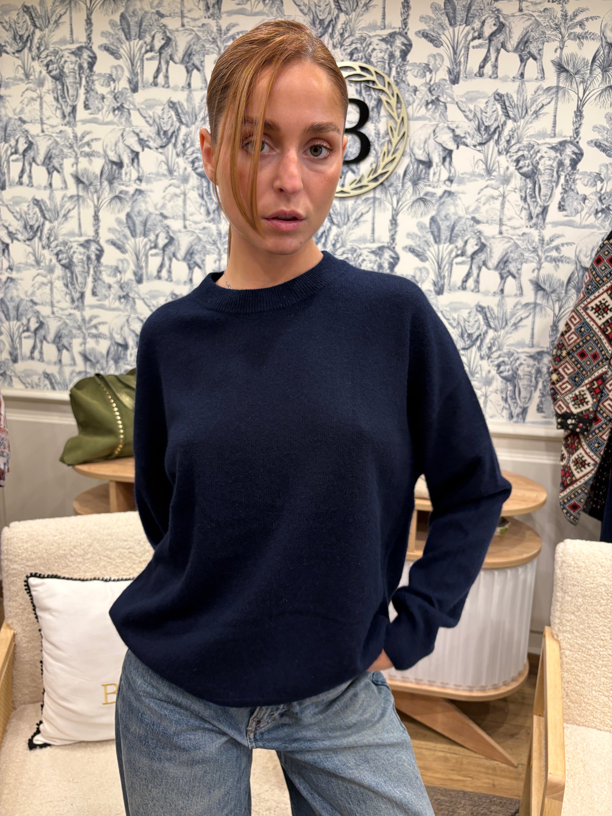 Un essentiel du vestiaire automnal : le pull en cachemire bleu marine. À la fois sobre et raffiné, il séduit par sa coupe droite et sa maille douce qui assure confort et élégance au quotidien.