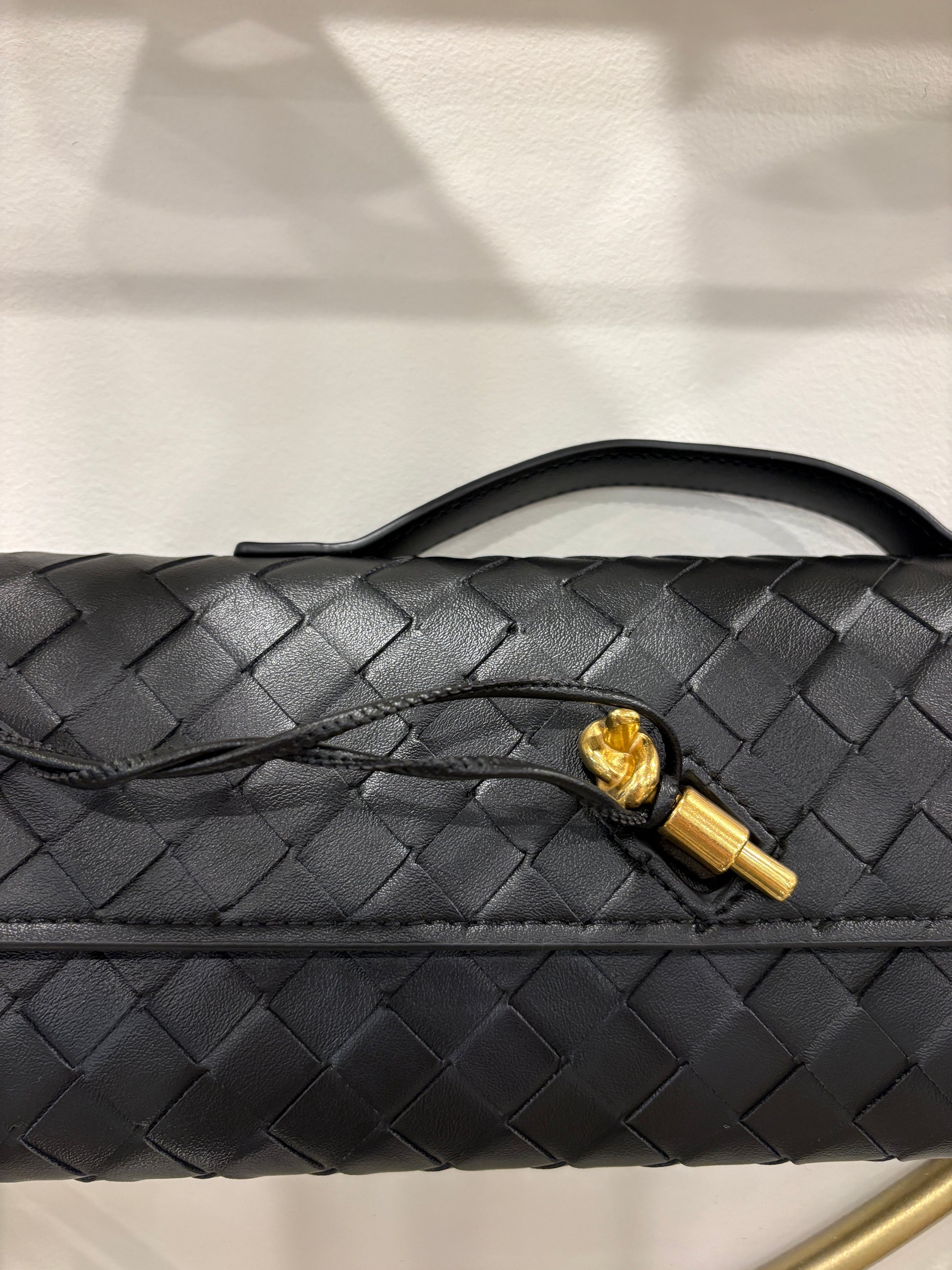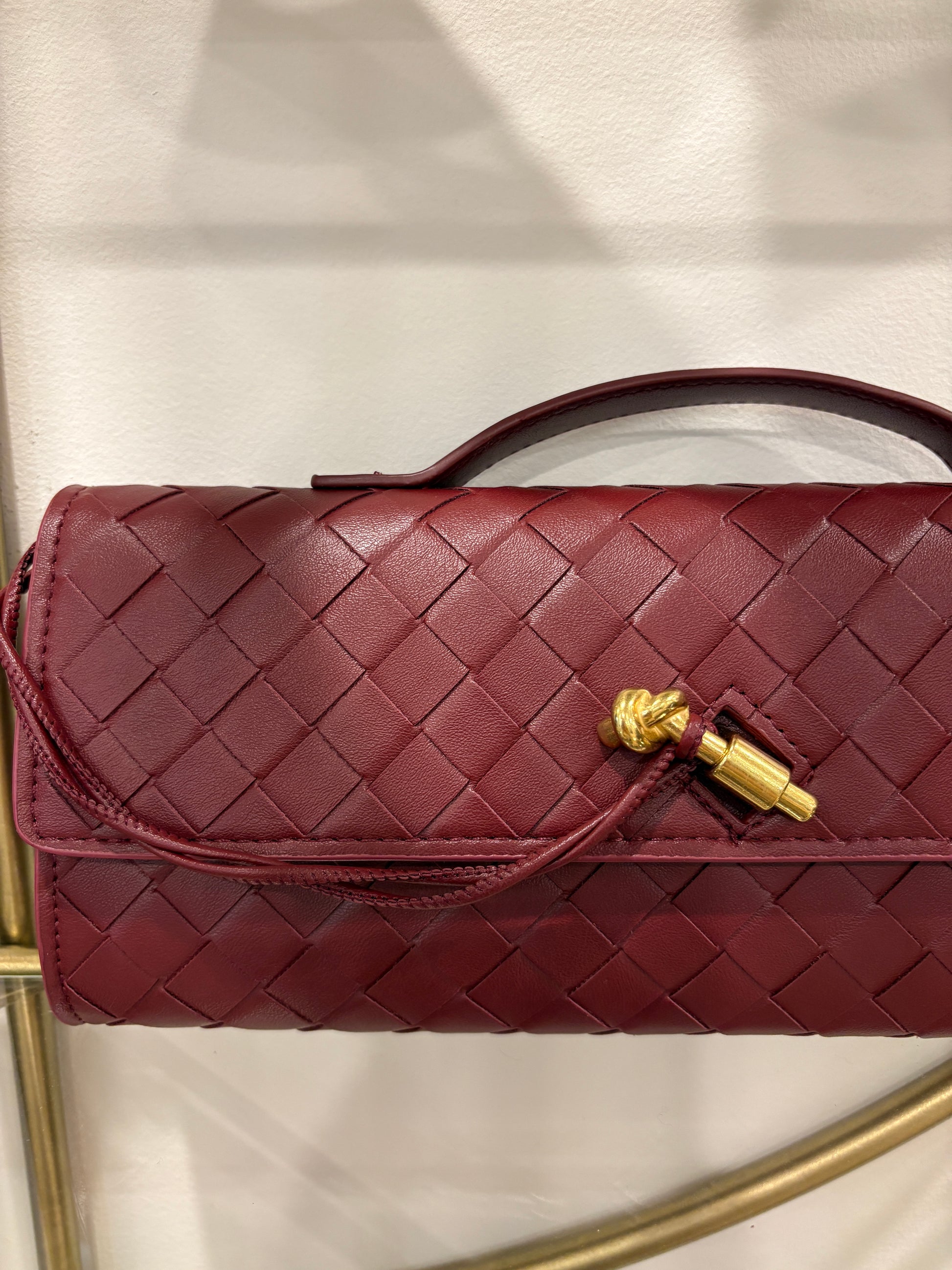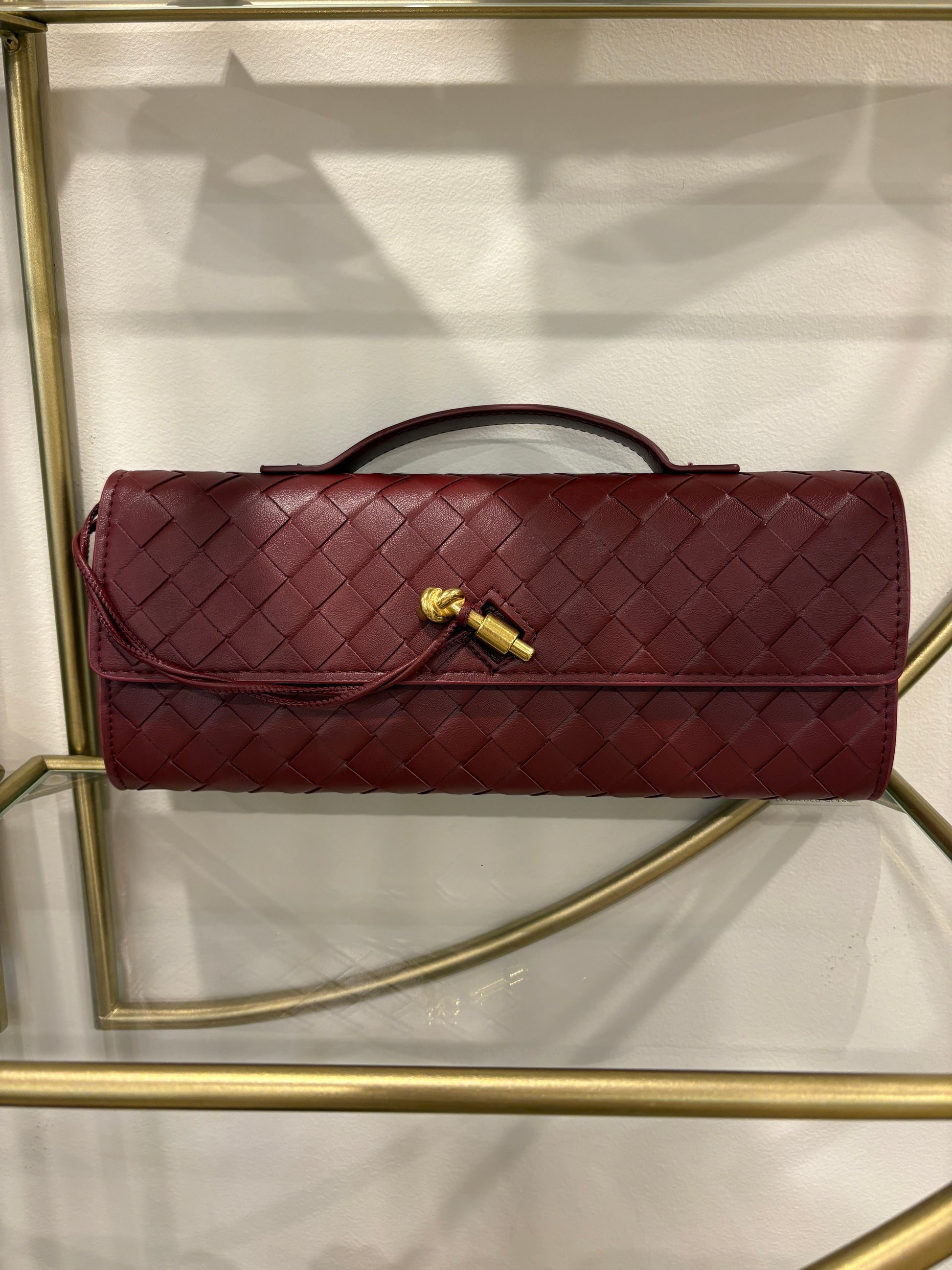 Sac en cuir tressé (style intrecciato) au format pochette allongée, avec rabat et petite anse sur le dessus. Fermeture élégante par lien avec détail nœud et embout métallique doré. Livré avec une bandoulière fine amovible pour le porter à l’épaule ou en crossbody. Finitions soignées et quincaillerie dorée, disponible en noir ou bordeaux.