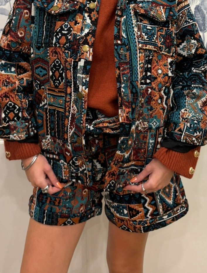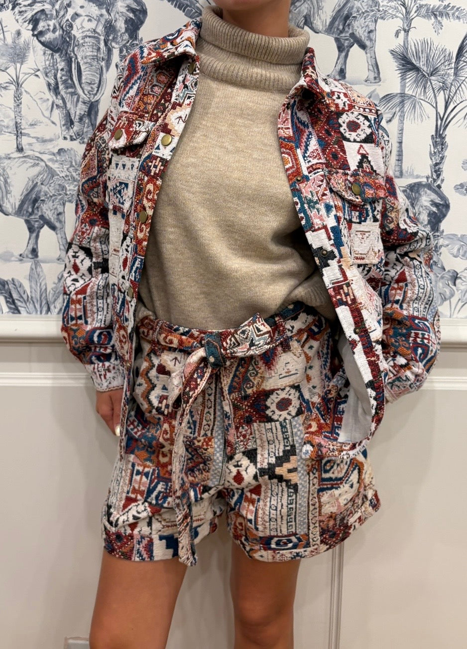 Un short original au motif ethnique et aux couleurs chaudes, parfait pour apporter du caractère à une tenue. Sa matière texturée et ses détails soignés en font une pièce à la fois tendance et confortable.