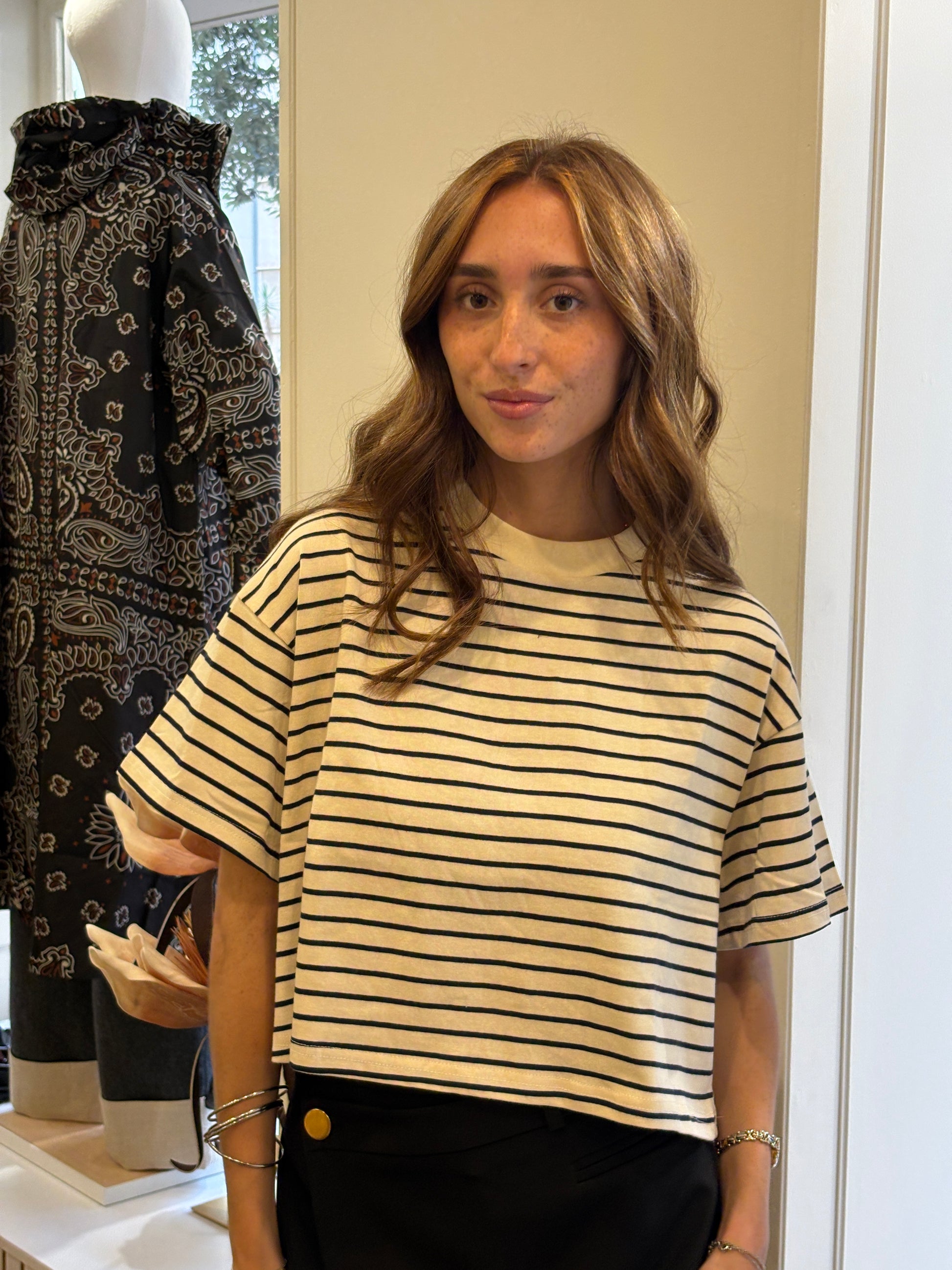 • Détails : rayures fines noires sur fond écru, col rond, manches amples à emmanchures descendues