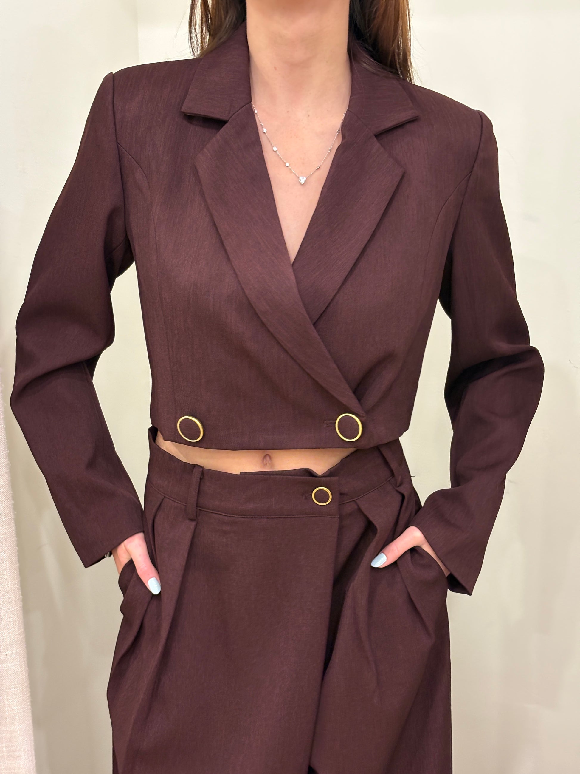 Une veste tailleur revisitée dans une version moderne et élégante. Sa coupe crop et ses détails dorés en font une pièce forte du dressing.